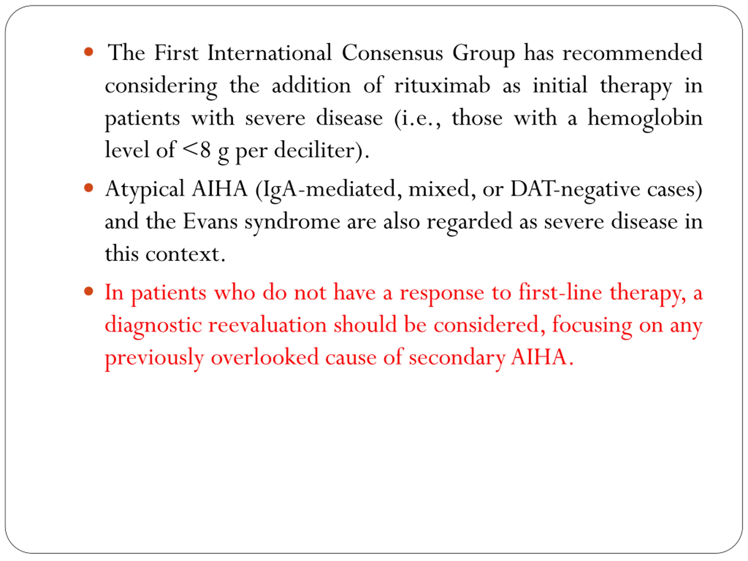 The First International Consensus Group has recommended considering the addition of rituximab as initial therapy in patients with severe disease (i.e., those with a hemoglobin level of <8 g per deciliter). Atypical AIHA (IgA-mediated,mixed,or DAT-negative cases) and the Evans syndrome are also regarded as severe disease in this context. In patients who do not have a response to first-line therapy, a diagnostic reevaluation should be considered,focusing on any previously overlooked cause of secondaryAIHA.