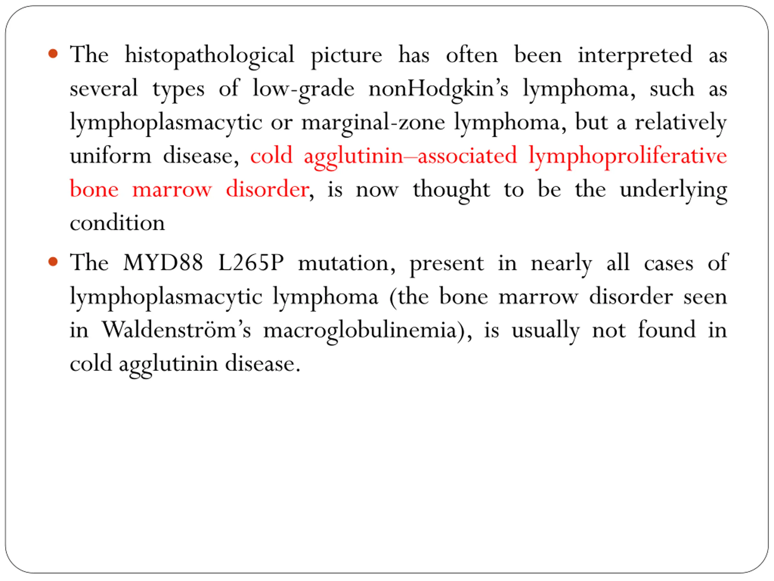 The histopathological picture has often been interpreted as several types of low-grade nonHodgkin s lymphoma, such as lymphoplasmacytic or marginal-zone lymphoma, but a relatively uniform disease, cold agglutinin associated lymphoproliferative bone marrow disorder, is now thought to be the underlying condition The MYD88 L265P mutation, present in nearly all cases of lymphoplasmacytic lymphoma (the bone marrow disorder seen in Waldenstr m s macroglobulinemia), is usually not found in cold agglutinin disease.