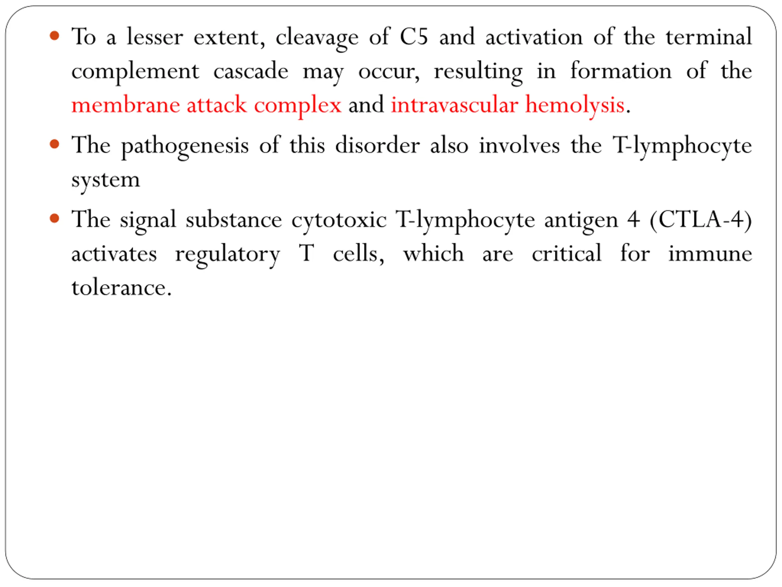 To a lesser extent, cleavage of C5 and activation of the terminal complement cascade may occur, resulting in formation of the membrane attack complex and intravascular hemolysis. The pathogenesis of this disorder also involves the T-lymphocyte system The signal substance cytotoxic T-lymphocyte antigen 4 (CTLA-4) activates regulatory T cells, which are critical for immune tolerance.