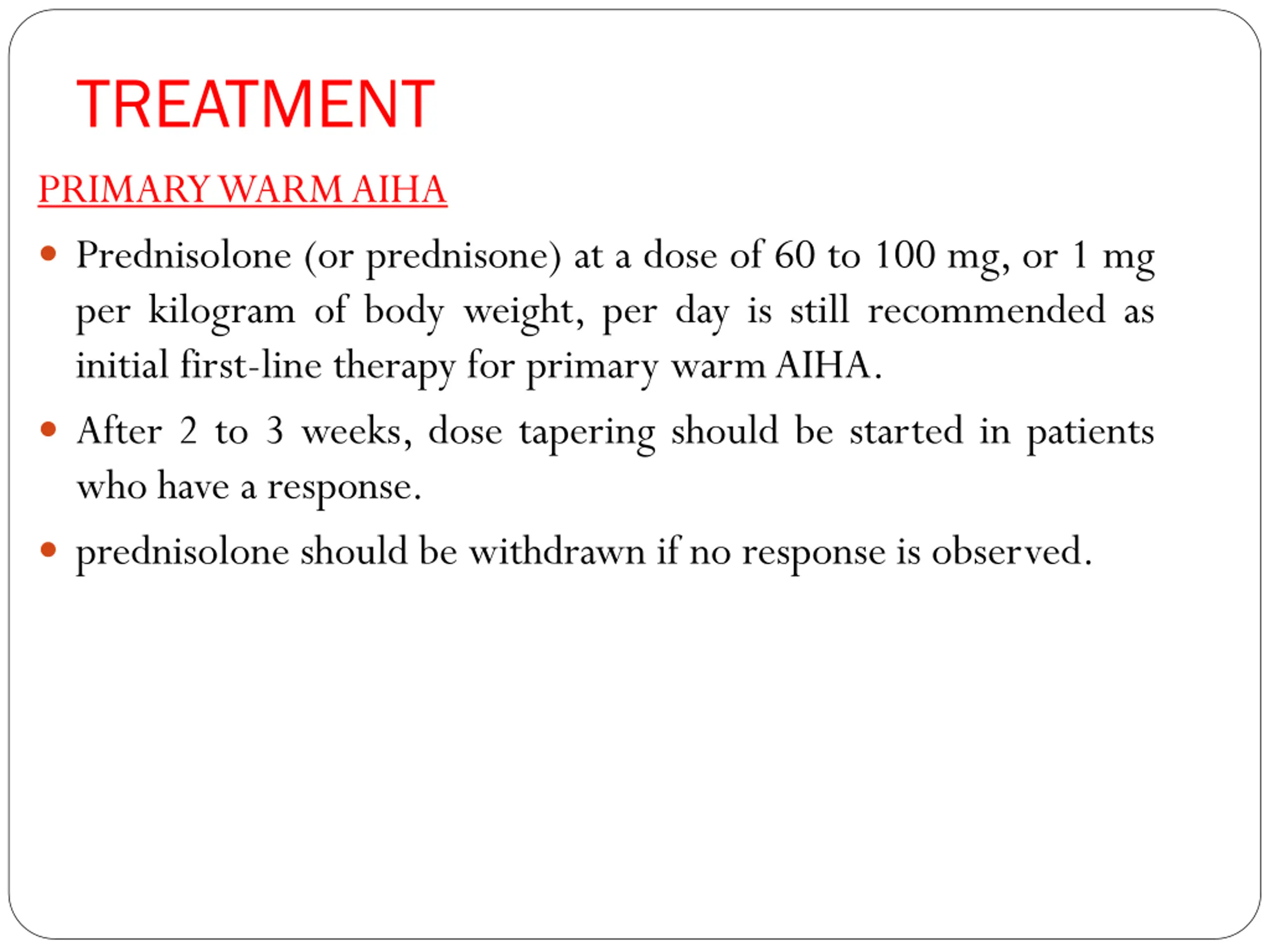 TREATMENT PRIMARYWARMAIHA Prednisolone (or prednisone) at a dose of 60 to 100 mg, or 1 mg per kilogram of body weight, per day is still recommended as initial first-line therapy for primary warmAIHA. After 2 to 3 weeks, dose tapering should be started in patients who have a response. prednisolone should be withdrawn if no response is observed.