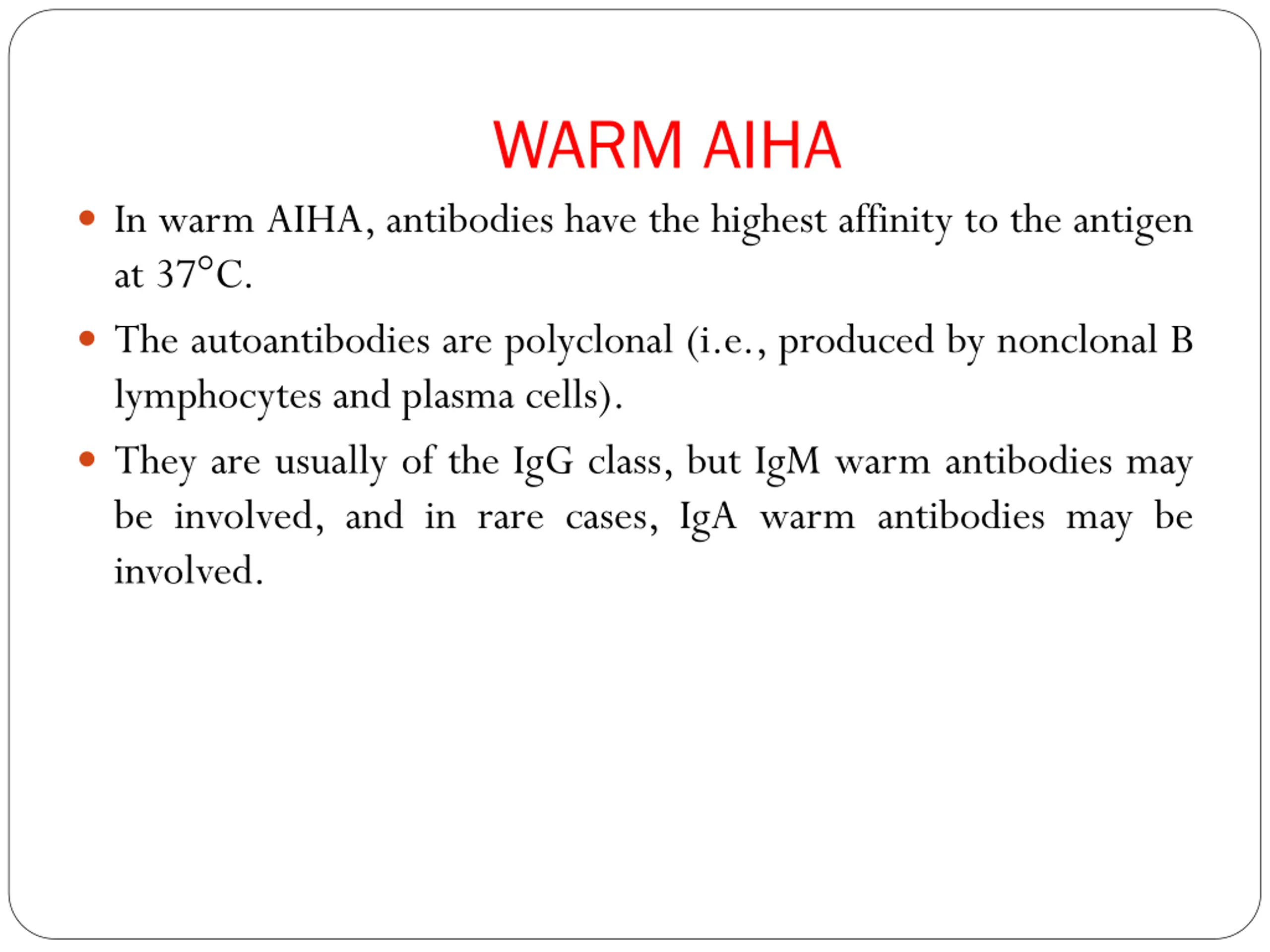 WARM AIHA In warm AIHA,antibodies have the highest affinity to the antigen at 37 C. The autoantibodies are polyclonal (i.e., produced by nonclonal B lymphocytes and plasma cells). They are usually of the IgG class, but IgM warm antibodies may be involved, and in rare cases, IgA warm antibodies may be involved.