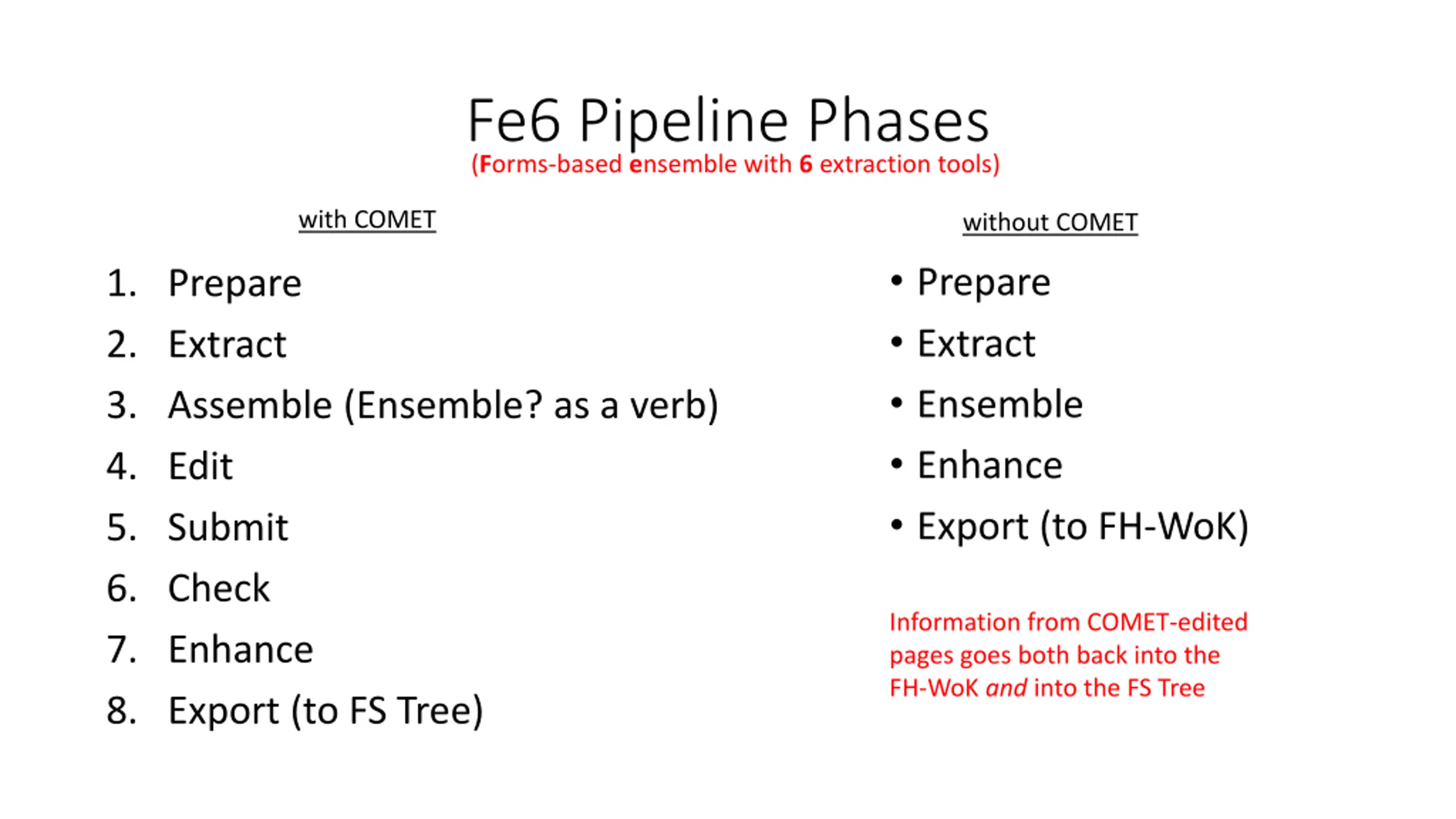 Fe6 Pipeline Phases (Forms-based ensemble with 6 extraction tools) with COMET without COMET Prepare Extract Ensemble Enhance Export (to FH-WoK) 1. Prepare 2. Extract 3. Assemble (Ensemble? as a verb) 4. Edit 5. Submit 6. Check 7. Enhance 8. Export (to FS Tree) Information from COMET-edited pages goes both back into the FH-WoK and into the FS Tree