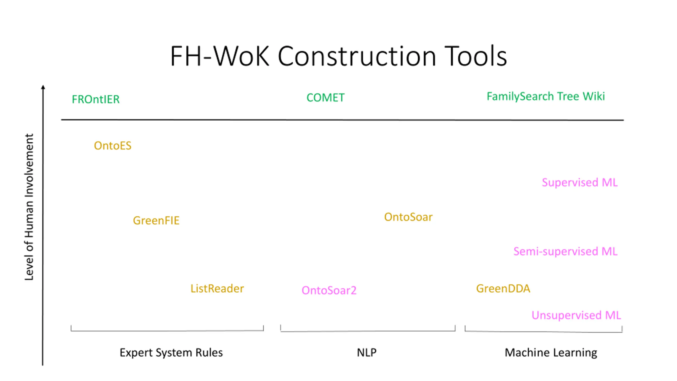 FH-WoK Construction Tools FamilySearch Tree Wiki COMET FROntIER Level of Human Involvement OntoES Supervised ML OntoSoar GreenFIE Semi-supervised ML ListReader GreenDDA OntoSoar2 Unsupervised ML Expert System Rules NLP Machine Learning