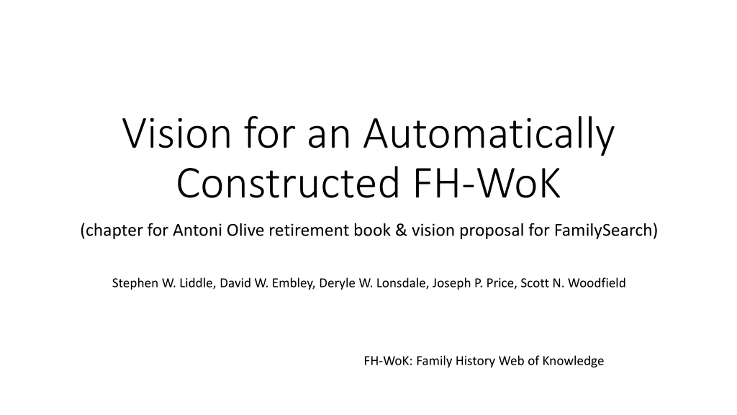 Vision for an Automatically Constructed FH-WoK (chapter for Antoni Olive retirement book & vision proposal for FamilySearch) Stephen W. Liddle, David W. Embley, Deryle W. Lonsdale, Joseph P. Price, Scott N. Woodfield FH-WoK: Family History Web of Knowledge