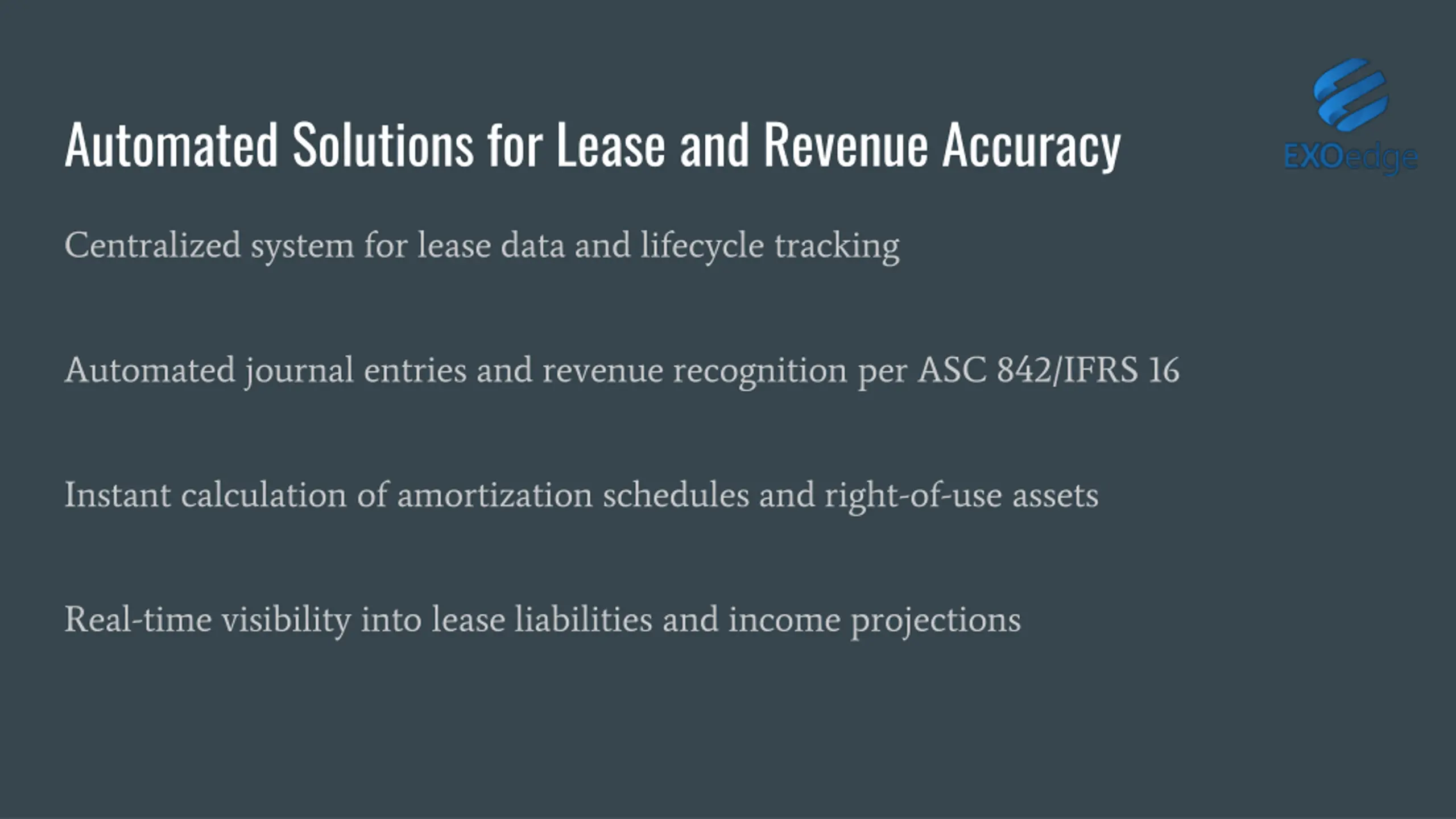 Automated Solutions for Lease and Revenue Accuracy Centralized system for lease data and lifecycle tracking Automated journal entries and revenue recognition per ASC 842/IFRS 16 Instant calculation of amortization schedules and right-of-use assets Real-time visibility into lease liabilities and income projections