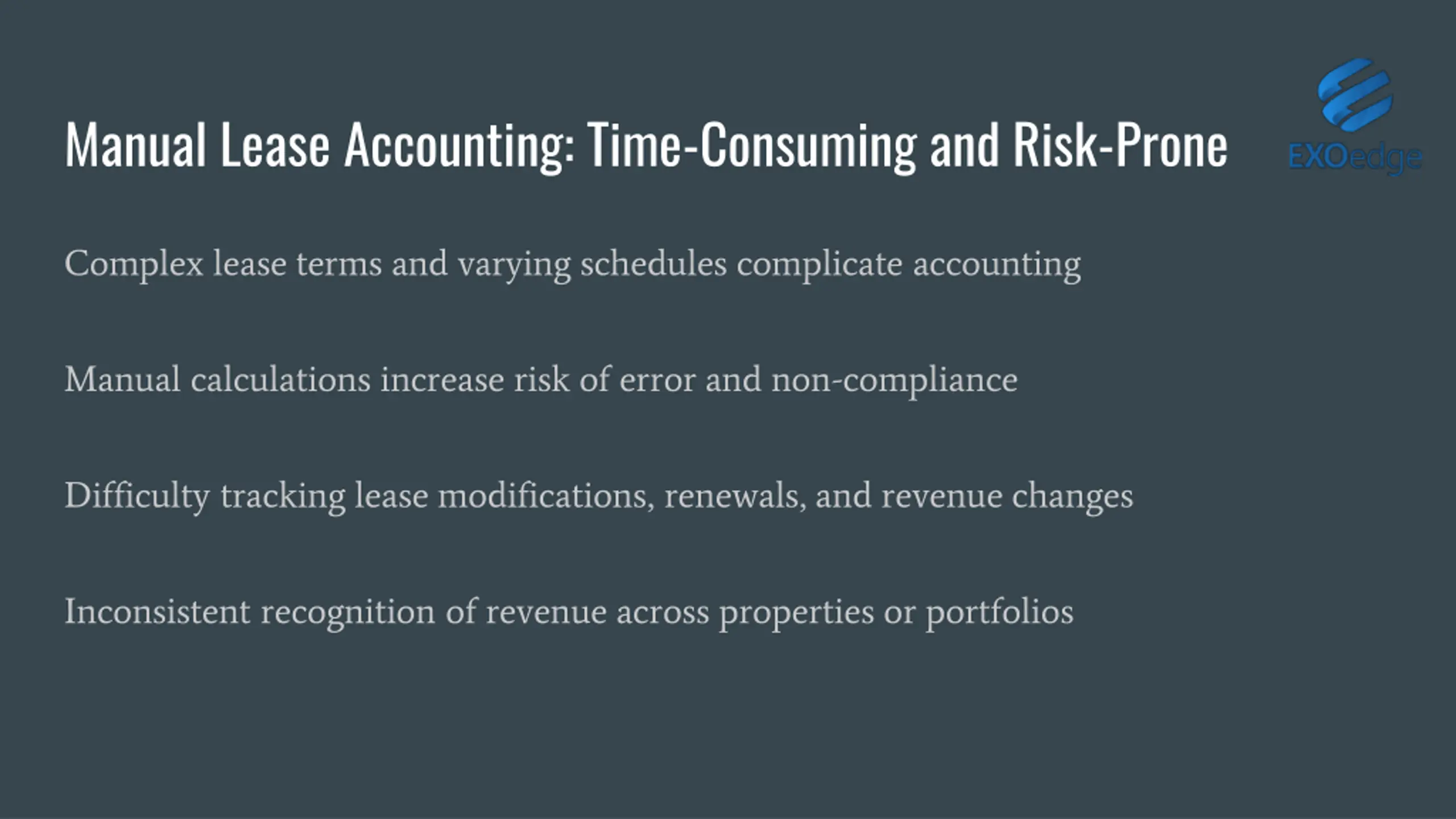 Manual Lease Accounting: Time-Consuming and Risk-Prone Complex lease terms and varying schedules complicate accounting Manual calculations increase risk of error and non-compliance Difficulty tracking lease modifications, renewals, and revenue changes Inconsistent recognition of revenue across properties or portfolios