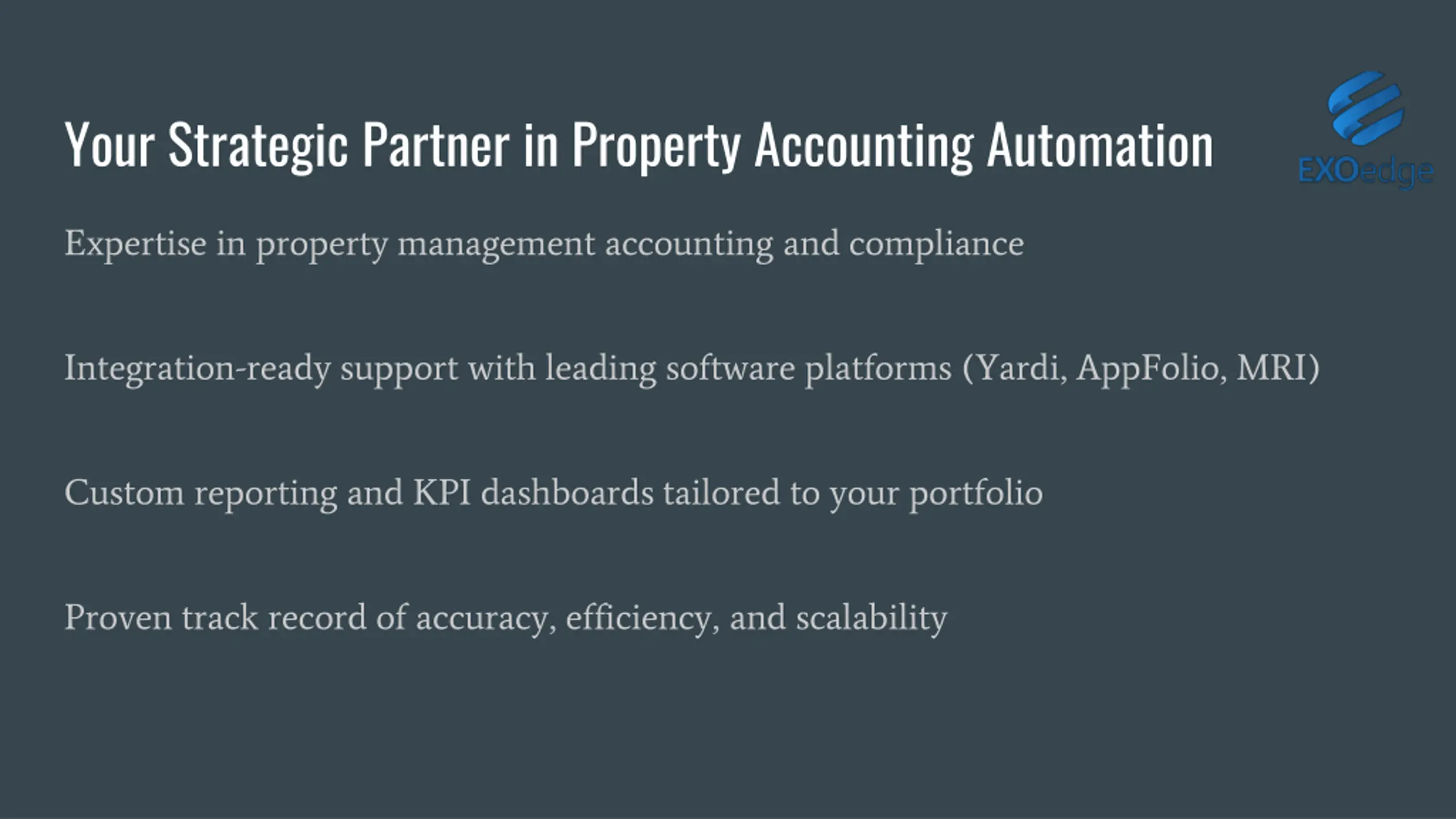 Your Strategic Partner in Property Accounting Automation Expertise in property management accounting and compliance Integration-ready support with leading software platforms (Yardi, AppFolio, MRI) Custom reporting and KPI dashboards tailored to your portfolio Proven track record of accuracy, efficiency, and scalability