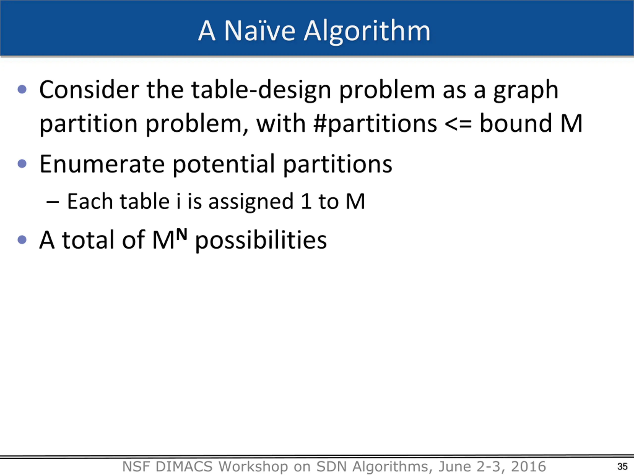A Nave Algorithm Consider the table-design problem as a graph partition problem, with #partitions <= bound M Enumerate potential partitions Each table i is assigned 1 to M A total of MN possibilities NSF DIMACS Workshop on SDN Algorithms, June 2-3, 2016 35