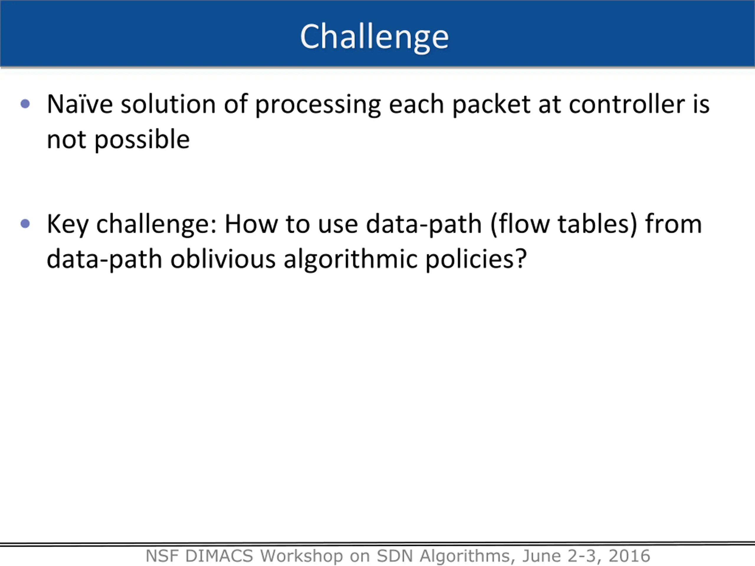 Challenge Na ve solution of processing each packet at controller is not possible Key challenge: How to use data-path (flow tables) from data-path oblivious algorithmic policies? NSF DIMACS Workshop on SDN Algorithms, June 2-3, 2016