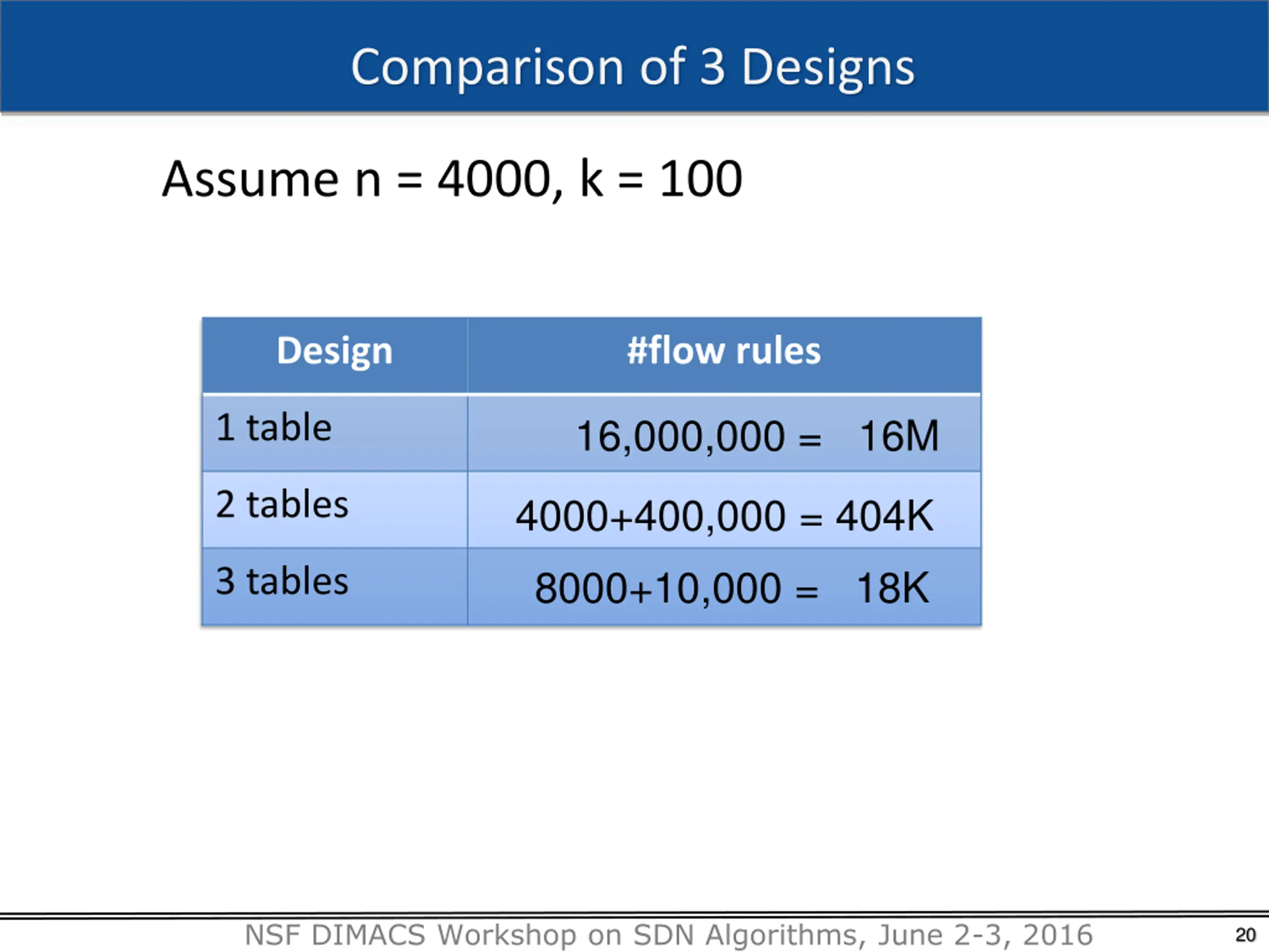 Comparison of 3 Designs Assume n = 4000, k = 100 Design #flow rules 1 table 16,000,000 = 16M 2 tables 4000+400,000 = 404K 8000+10,000 = 18K 3 tables NSF DIMACS Workshop on SDN Algorithms, June 2-3, 2016 20