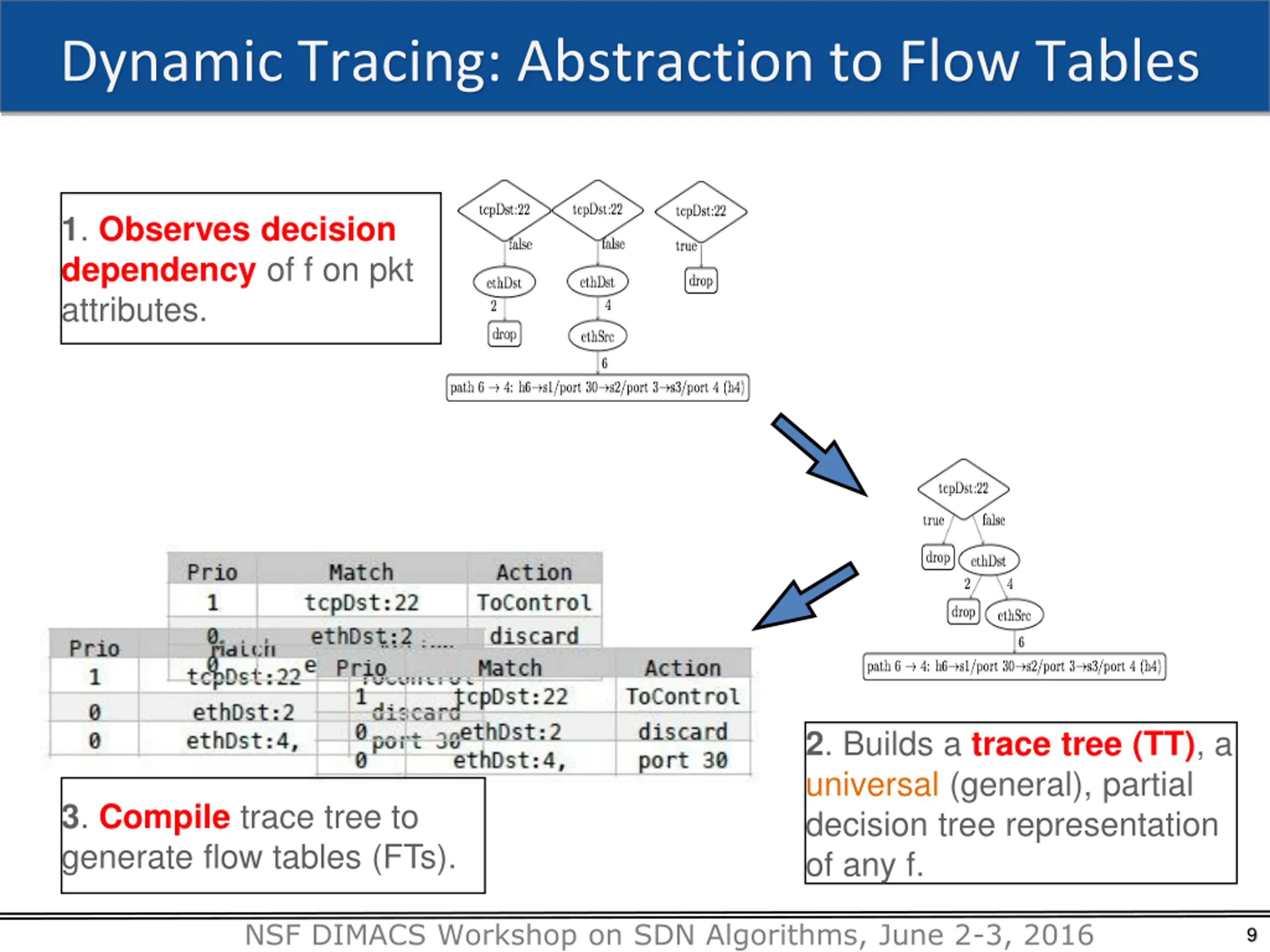 Dynamic Tracing: Abstraction to Flow Tables 1. Observes decision dependency of f on pkt attributes. 2. Builds a trace tree (TT), a universal (general), partial decision tree representation of any f. 3. Compile trace tree to generate flow tables (FTs). NSF DIMACS Workshop on SDN Algorithms, June 2-3, 2016 9