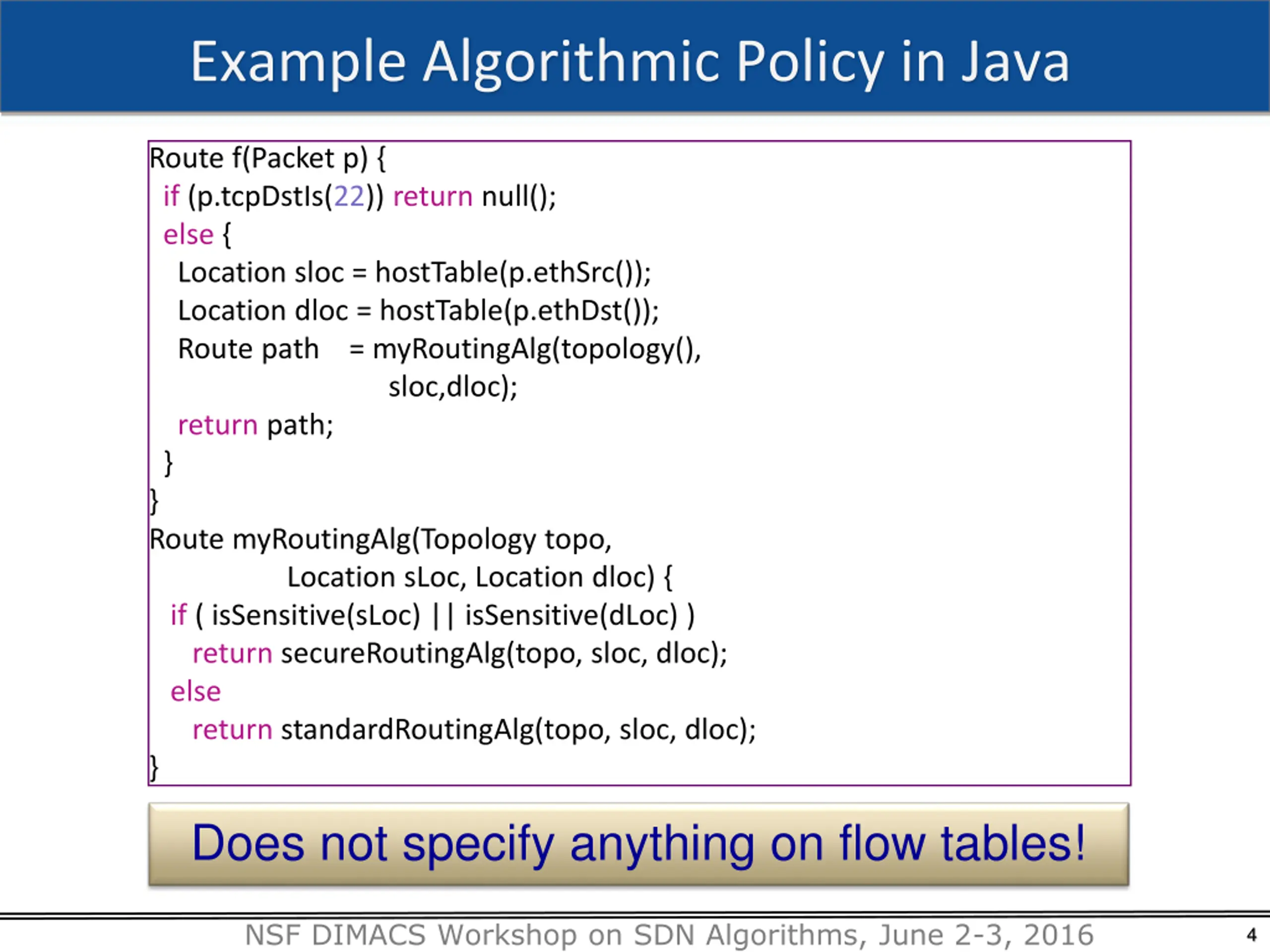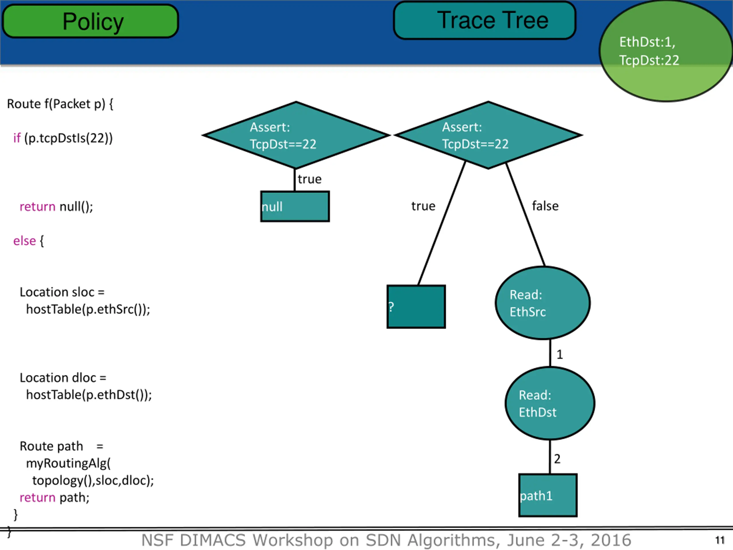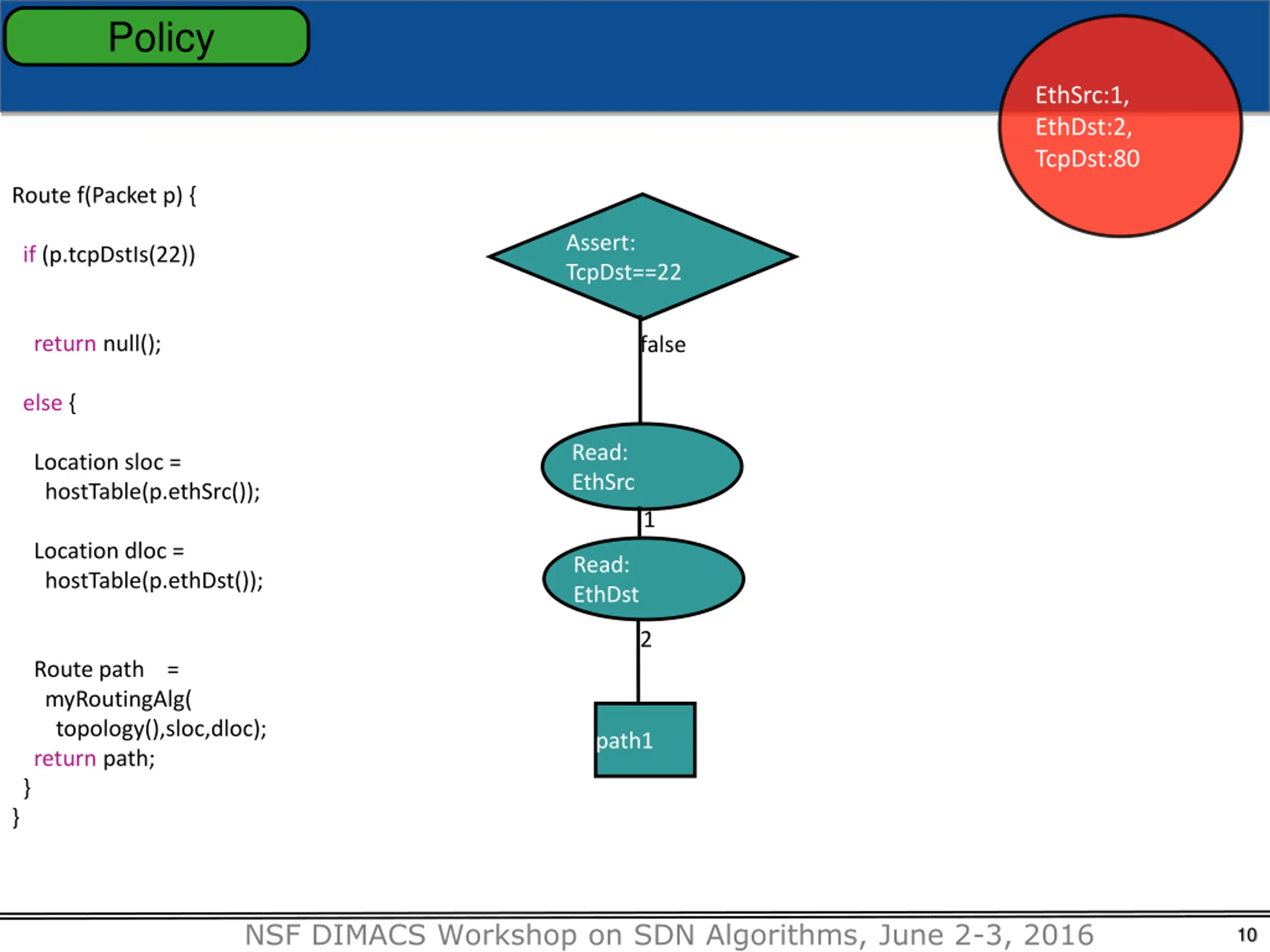 Policy EthSrc:1, EthDst:2, TcpDst:80 Route f(Packet p) { Assert: TcpDst==22 if (p.tcpDstIs(22)) return null(); false else { Read: EthSrc Location sloc = hostTable(p.ethSrc()); 1 Location dloc = hostTable(p.ethDst()); Read: EthDst 2 Route path = myRoutingAlg( topology(),sloc,dloc); return path; } } path1 NSF DIMACS Workshop on SDN Algorithms, June 2-3, 2016 10