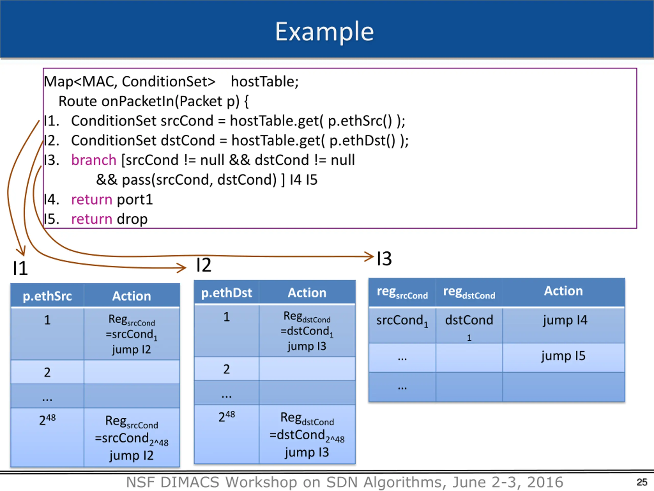 Example Map<MAC, ConditionSet> hostTable; Route onPacketIn(Packet p) { I1. ConditionSet srcCond = hostTable.get( p.ethSrc() ); I2. ConditionSet dstCond = hostTable.get( p.ethDst() ); I3. branch [srcCond != null && dstCond != null && pass(srcCond, dstCond) ] I4 I5 I4. return port1 I5. return drop I3 I2 I1 regsrcCond regdstCond Action p.ethDst Action p.ethSrc Action RegdstCond =dstCond1 jump I3 1 RegsrcCond =srcCond1 jump I2 srcCond1 dstCond jump I4 1 1 jump I5 2 2 ... ... 248 RegdstCond =dstCond2^48 jump I3 248 RegsrcCond =srcCond2^48 jump I2 NSF DIMACS Workshop on SDN Algorithms, June 2-3, 2016 25