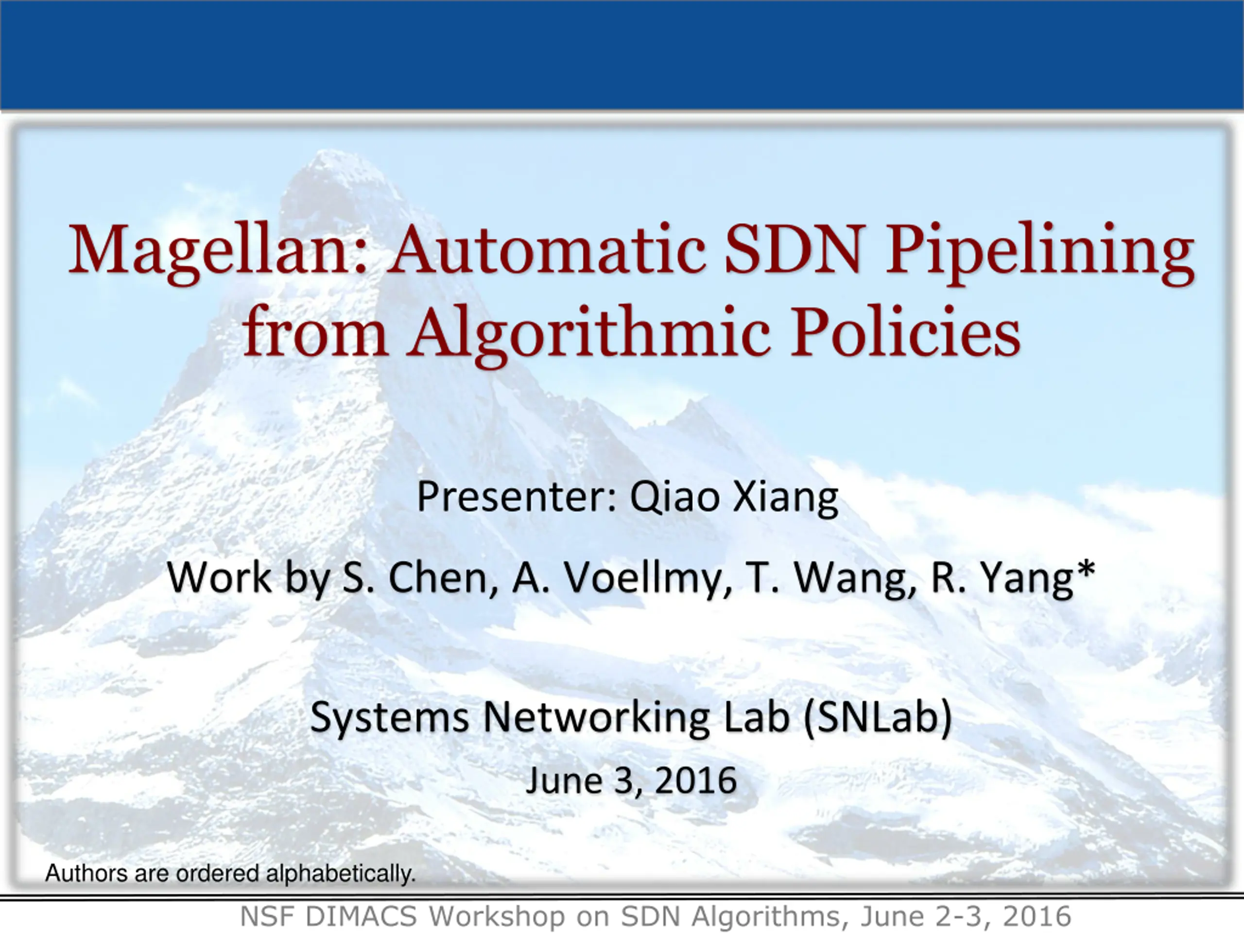 Magellan: Automatic SDN Pipelining from Algorithmic Policies Presenter: Qiao Xiang Work by S. Chen, A. Voellmy, T. Wang, R. Yang* Systems Networking Lab (SNLab) June 3, 2016 Authors are ordered alphabetically. NSF DIMACS Workshop on SDN Algorithms, June 2-3, 2016