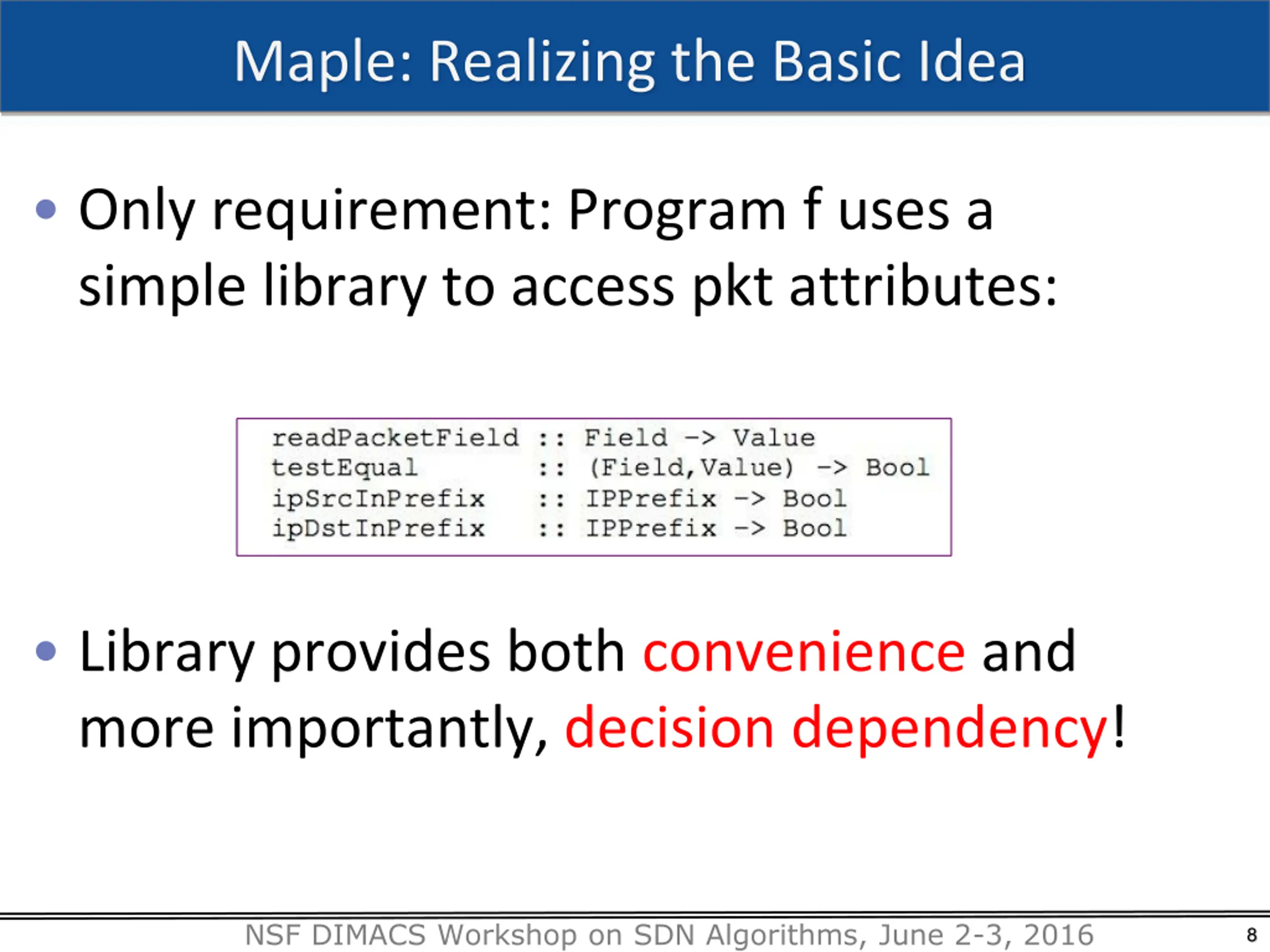 Maple: Realizing the Basic Idea Only requirement: Program f uses a simple library to access pkt attributes: Library provides both convenience and more importantly, decision dependency! NSF DIMACS Workshop on SDN Algorithms, June 2-3, 2016 8