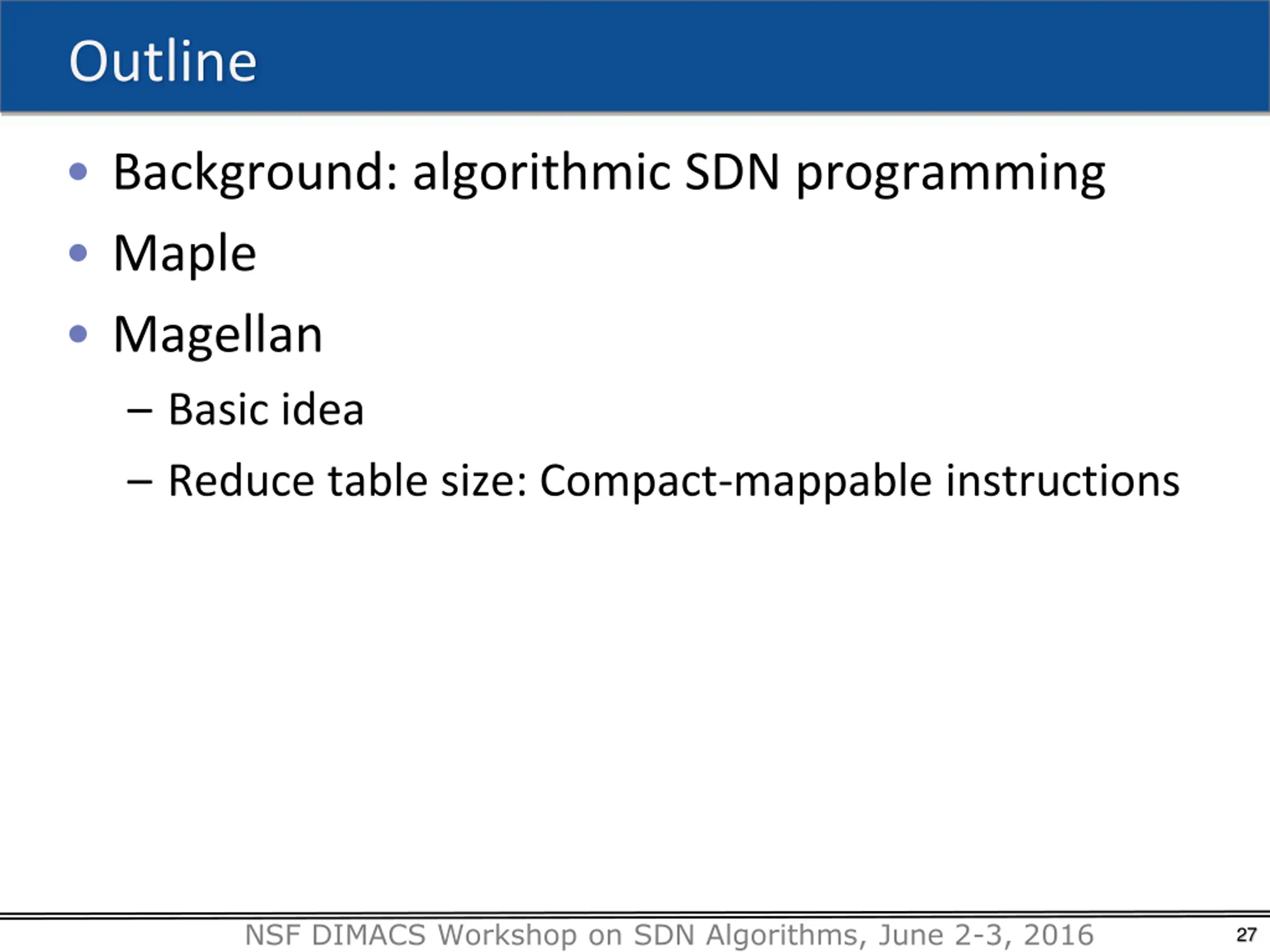 Outline Background: algorithmic SDN programming Maple Magellan Basic idea Reduce table size: Compact-mappable instructions NSF DIMACS Workshop on SDN Algorithms, June 2-3, 2016 27