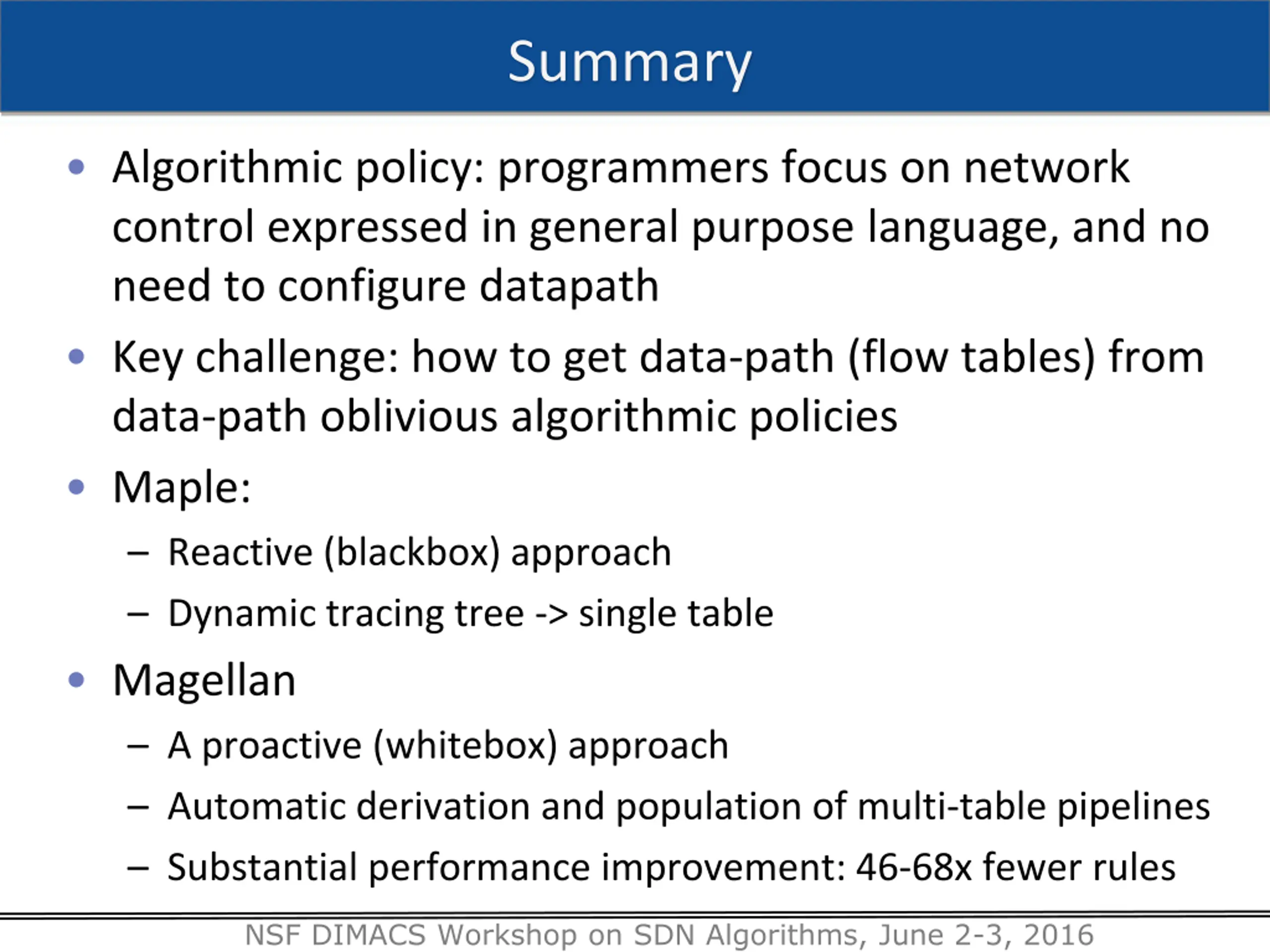 Summary Algorithmic policy: programmers focus on network control expressed in general purpose language, and no need to configure datapath Key challenge: how to get data-path (flow tables) from data-path oblivious algorithmic policies Maple: Reactive (blackbox) approach Dynamic tracing tree -> single table Magellan A proactive (whitebox) approach Automatic derivation and population of multi-table pipelines Substantial performance improvement: 46-68x fewer rules NSF DIMACS Workshop on SDN Algorithms, June 2-3, 2016
