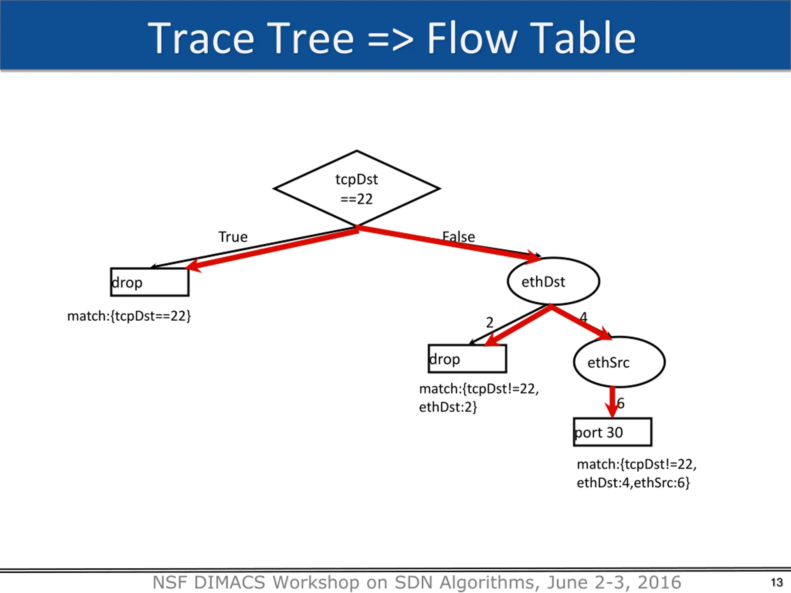 Trace Tree => Flow Table tcpDst ==22 True False ethDst drop match:{tcpDst==22} 4 2 drop ethSrc match:{tcpDst!=22, ethDst:2} 6 port 30 match:{tcpDst!=22, ethDst:4,ethSrc:6} NSF DIMACS Workshop on SDN Algorithms, June 2-3, 2016 13