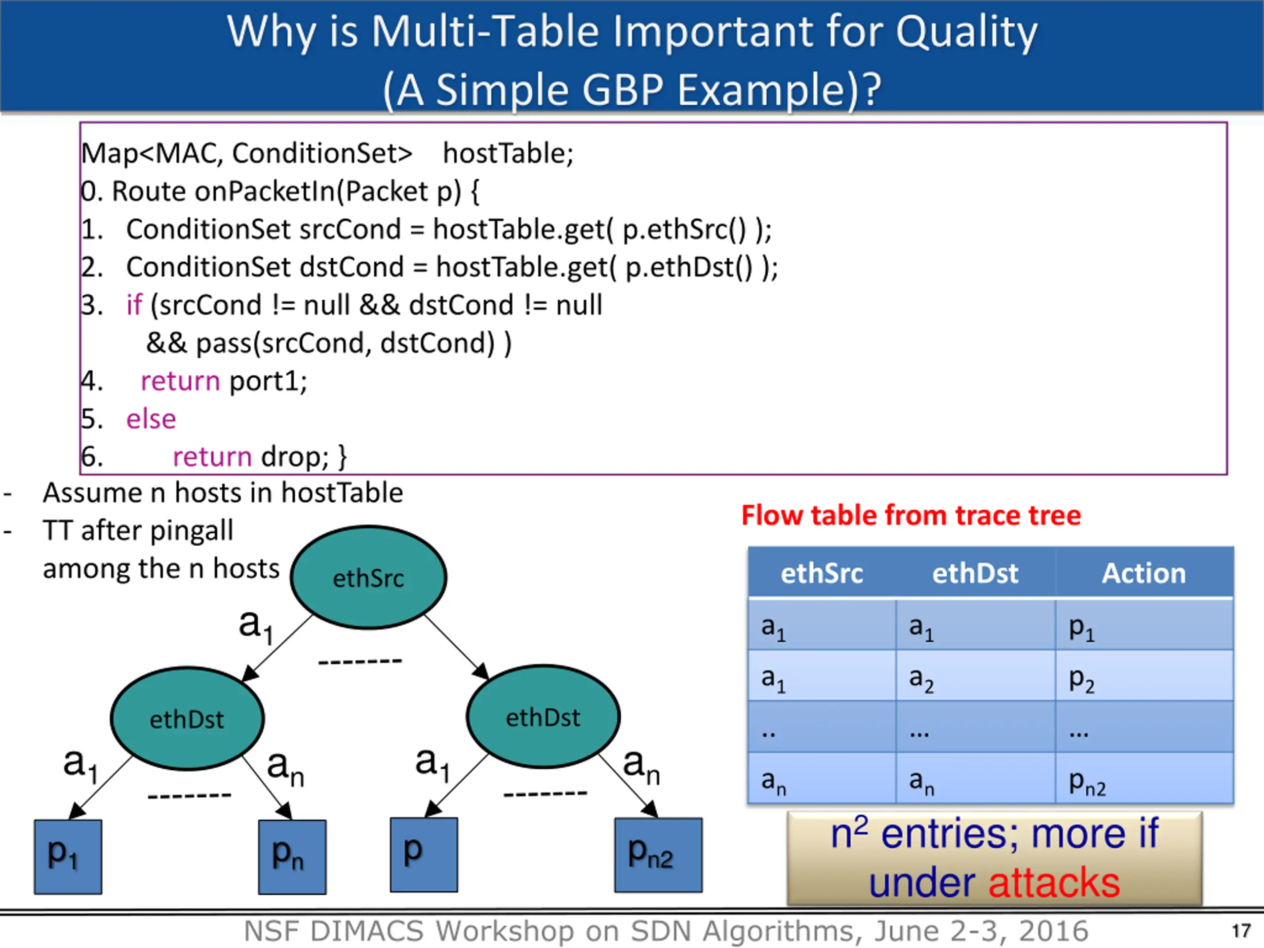 Why is Multi-Table Important for Quality (A Simple GBP Example)? Map<MAC, ConditionSet> hostTable; 0. Route onPacketIn(Packet p) { 1. ConditionSet srcCond = hostTable.get( p.ethSrc() ); 2. ConditionSet dstCond = hostTable.get( p.ethDst() ); 3. if (srcCond != null && dstCond != null && pass(srcCond, dstCond) ) 4. return port1; 5. else 6. return drop; } - - Assume n hosts in hostTable TT after pingall among the n hosts Flow table from trace tree ethSrc ethDst Action ethSrc a1 a1 a1 .. a1 a2 p1 p2 ethDst ethDst a1 a1 an an an an pn2 n2 entries; more if under attacks p pn2 p1 pn NSF DIMACS Workshop on SDN Algorithms, June 2-3, 2016 17