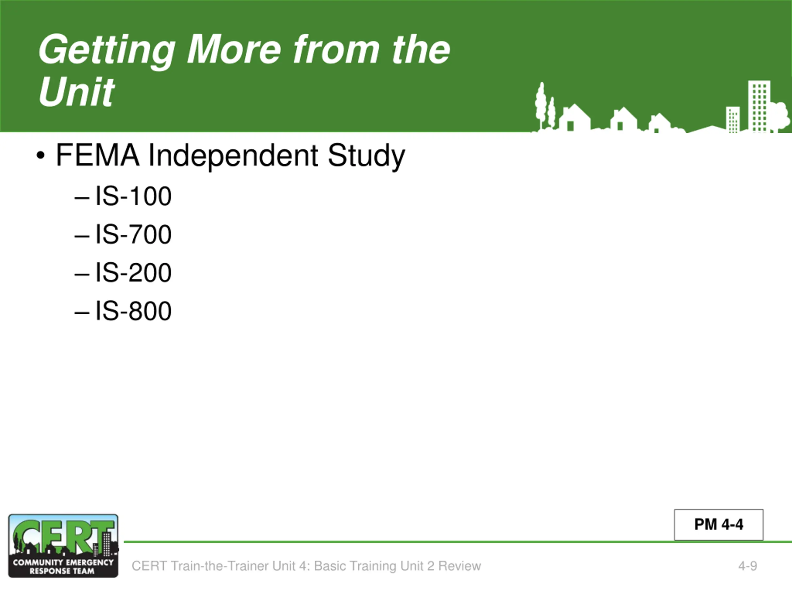 Getting More from the Unit(Unit 4) FEMA Independent Study IS-100 IS-700 IS-200 IS-800 PM 4-4 CERT Train-the-Trainer Unit 4: Basic Training Unit 2 Review 4-9