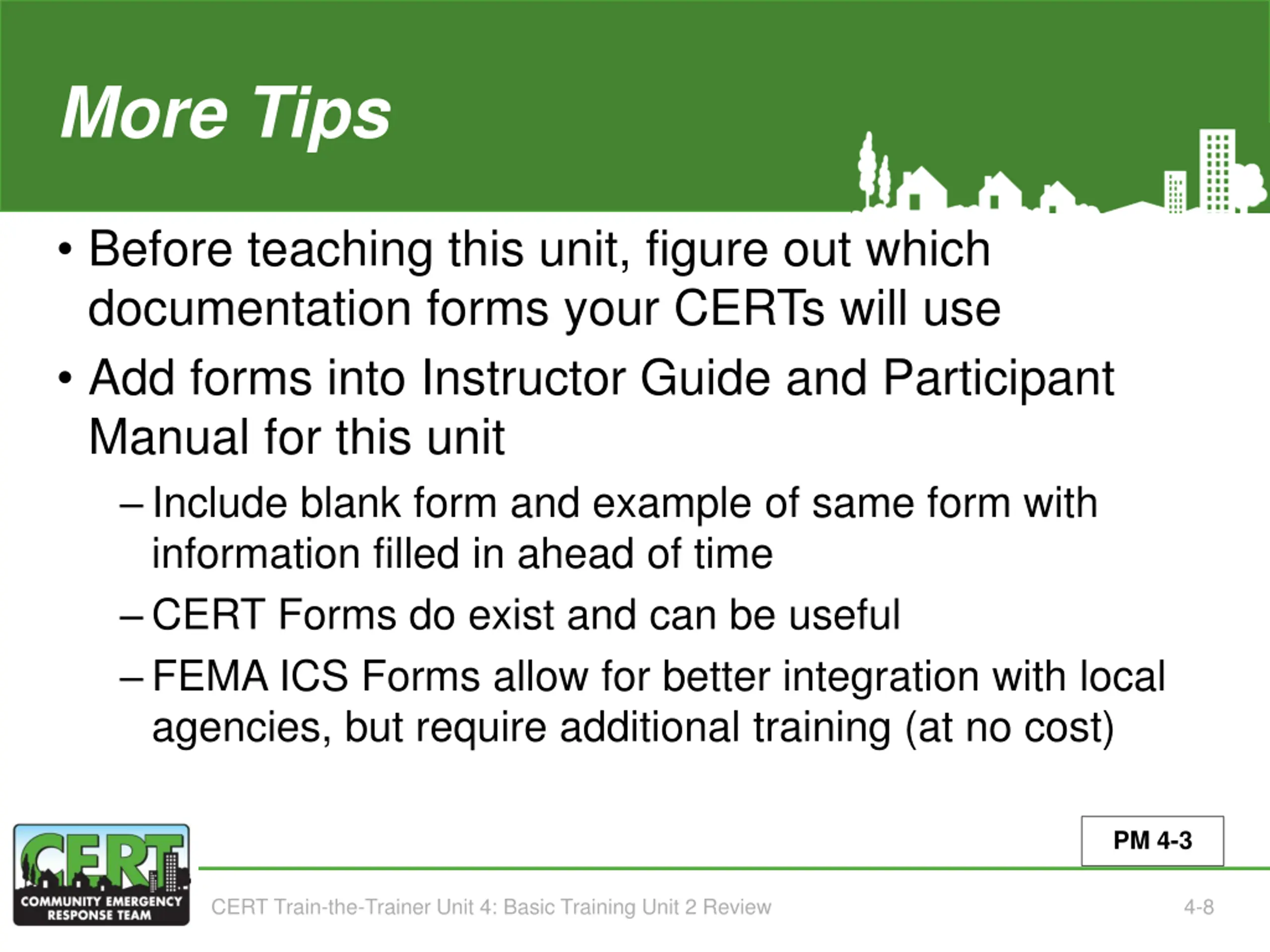 More Tips (Tips for Teaching Unit 2, continued) Before teaching this unit, figure out which documentation forms your CERTs will use Add forms into Instructor Guide and Participant Manual for this unit Include blank form and example of same form with information filled in ahead of time CERT Forms do exist and can be useful FEMA ICS Forms allow for better integration with local agencies, but require additional training (at no cost) PM 4-3 CERT Train-the-Trainer Unit 4: Basic Training Unit 2 Review 4-8