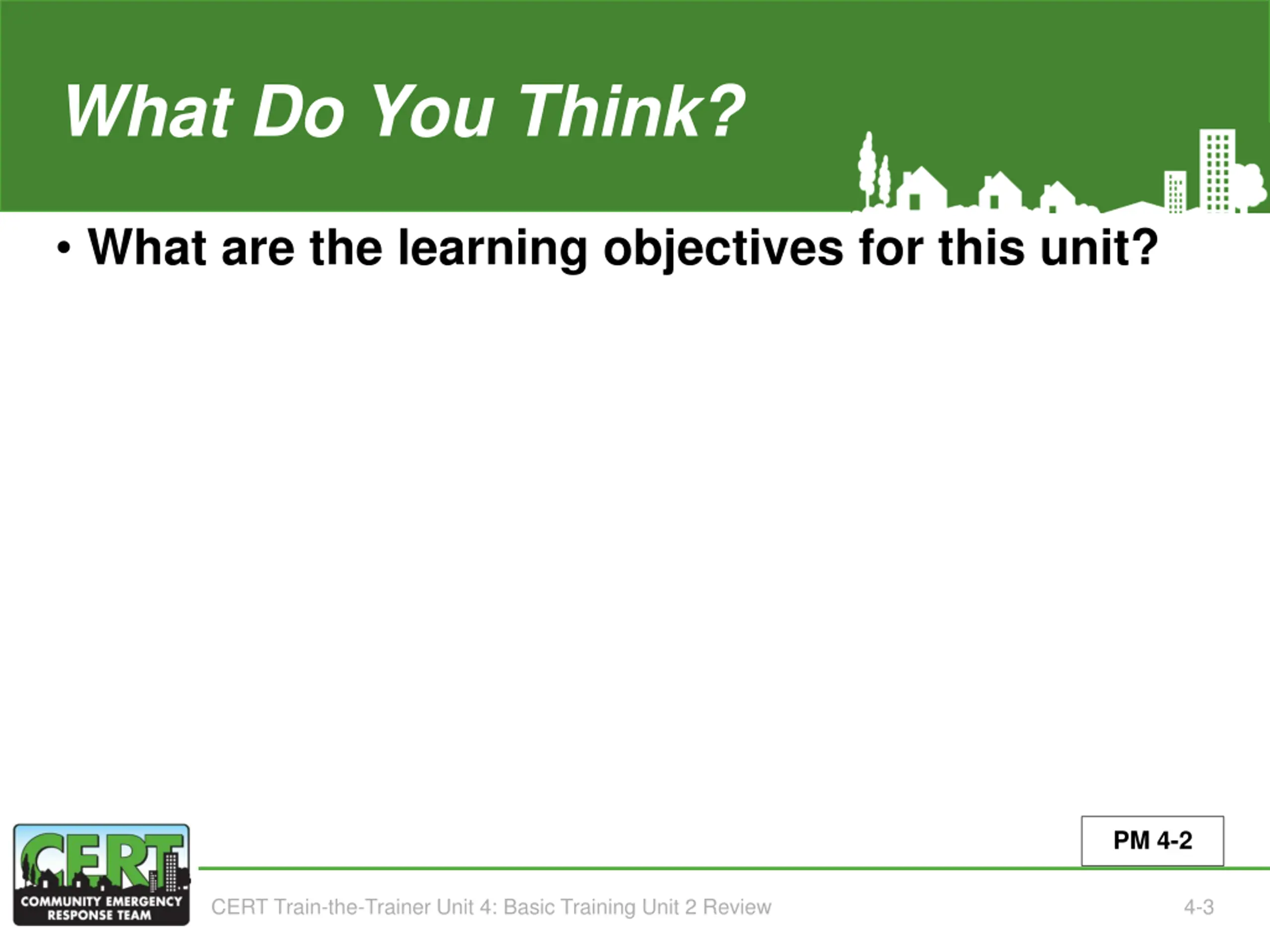 What Do You Think? What are the learning objectives for this unit? (Unit 2)( PM 4-2 CERT Train-the-Trainer Unit 4: Basic Training Unit 2 Review 4-3