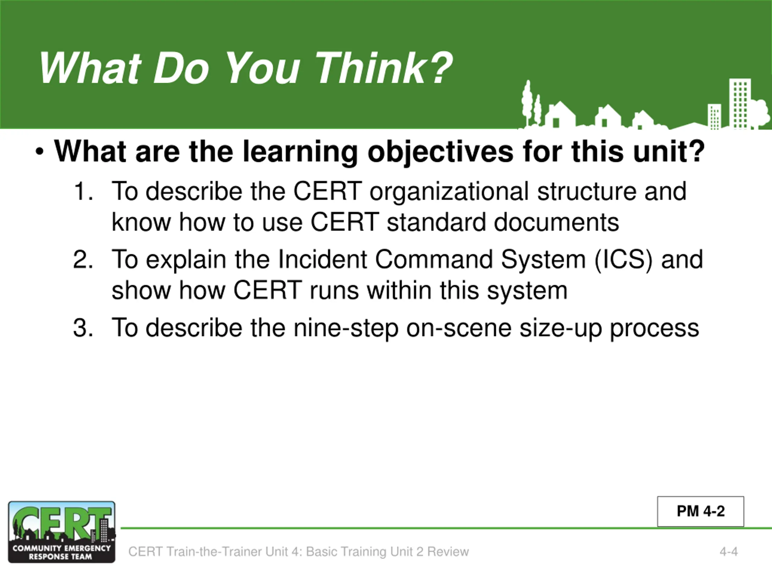 What Do You Think? Learning Objectives (Unit 2) What are the learning objectives for this unit? 1. To describe the CERT organizational structure and know how to use CERT standard documents 2. To explain the Incident Command System (ICS) and show how CERT runs within this system 3. To describe the nine-step on-scene size-up process PM 4-2 CERT Train-the-Trainer Unit 4: Basic Training Unit 2 Review 4-4