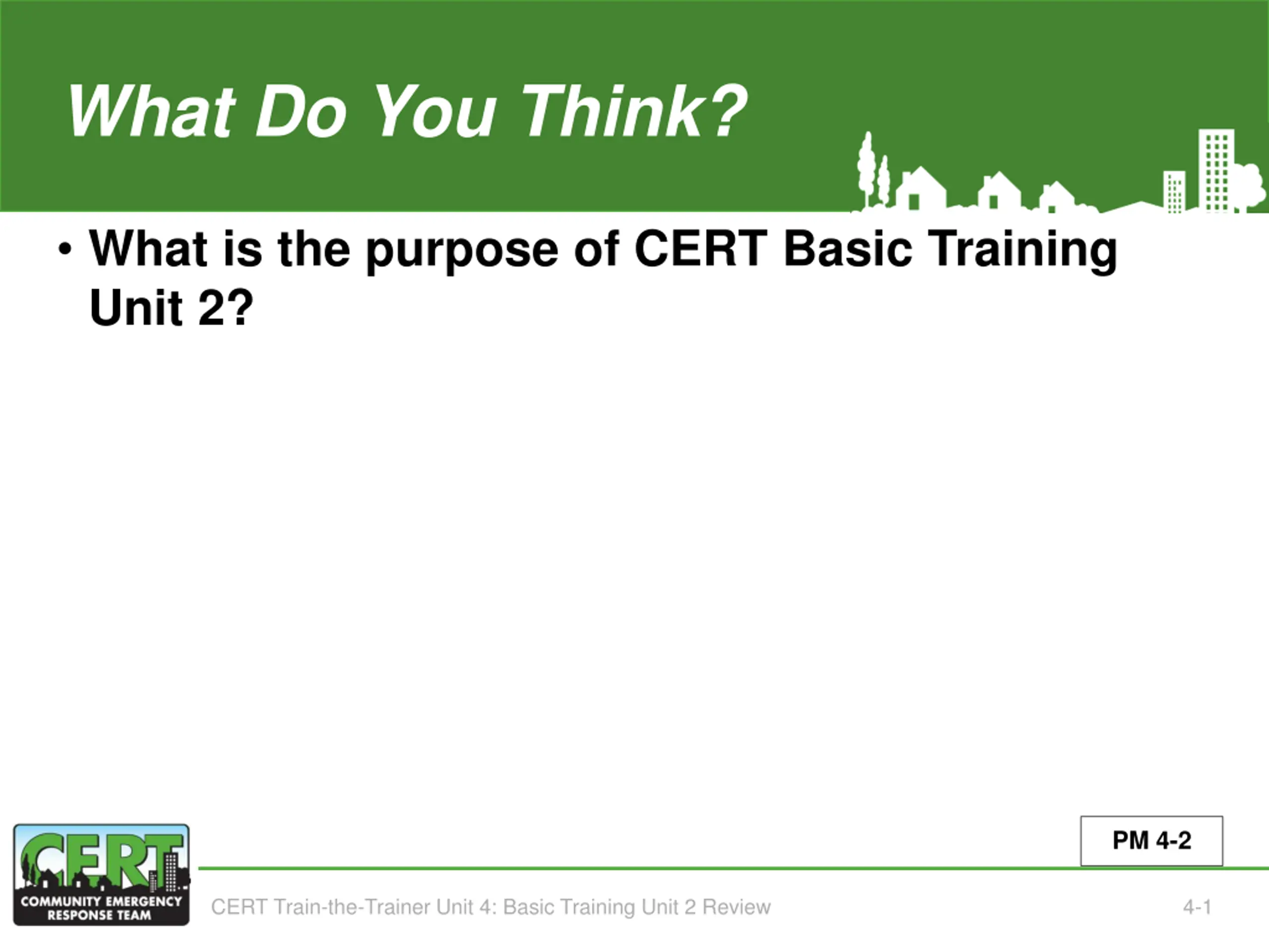 What Do You Think? What is the purpose of CERT Basic Training Unit 2? PM 4-2 CERT Train-the-Trainer Unit 4: Basic Training Unit 2 Review 4-1