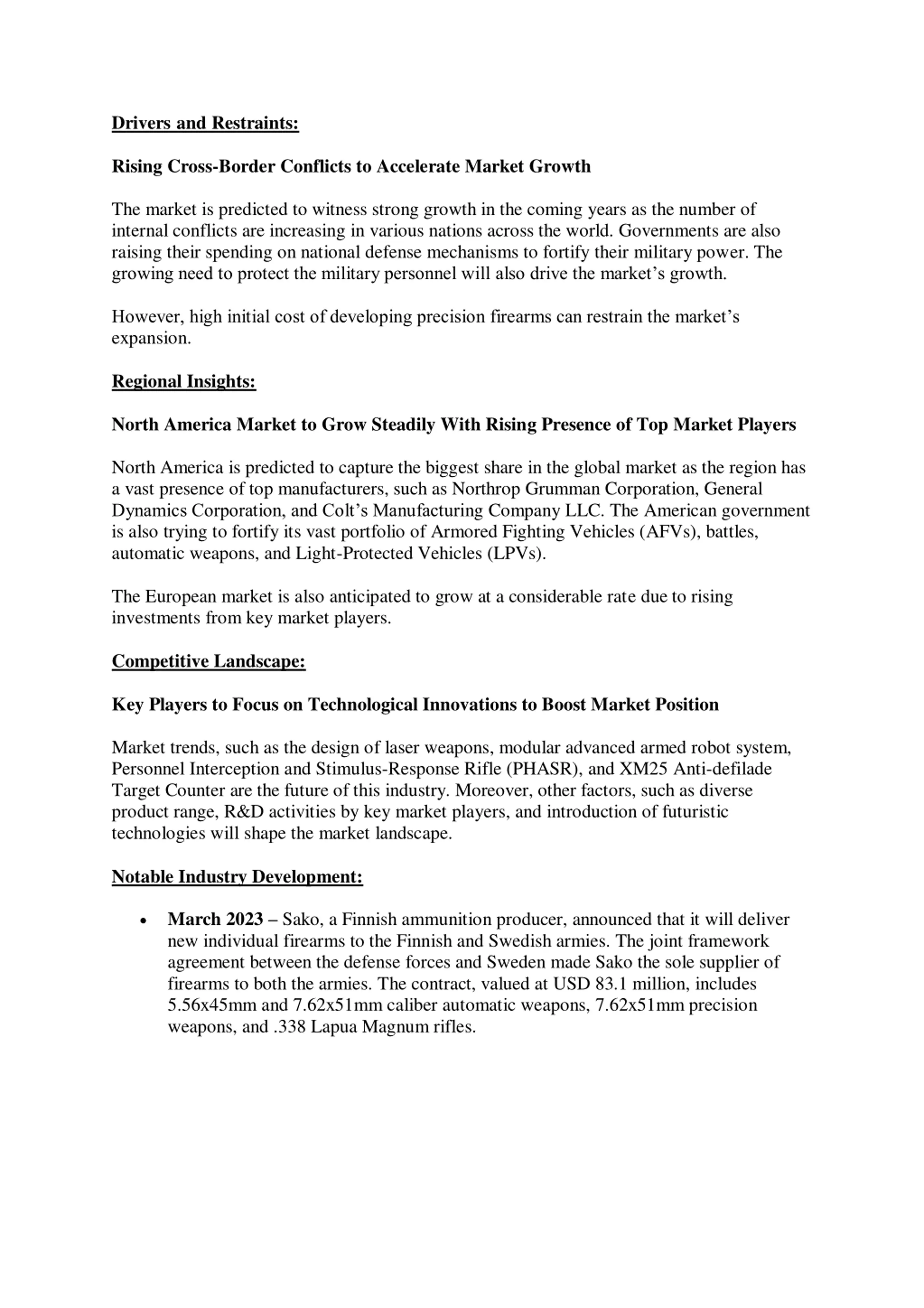 Drivers and Restraints: Rising Cross-Border Conflicts to Accelerate Market Growth The market is predicted to witness strong growth in the coming years as the number of internal conflicts are increasing in various nations across the world. Governments are also raising their spending on national defense mechanisms to fortify their military power. The growing need to protect the military personnel will also drive the market s growth. However, high initial cost of developing precision firearms can restrain the market s expansion. Regional Insights: North America Market to Grow Steadily With Rising Presence of Top Market Players North America is predicted to capture the biggest share in the global market as the region has a vast presence of top manufacturers, such as Northrop Grumman Corporation, General Dynamics Corporation, and Colt s Manufacturing Company LLC. The American government is also trying to fortify its vast portfolio of Armored Fighting Vehicles (AFVs), battles, automatic weapons, and Light-Protected Vehicles (LPVs). The European market is also anticipated to grow at a considerable rate due to rising investments from key market players. Competitive Landscape: Key Players to Focus on Technological Innovations to Boost Market Position Market trends, such as the design of laser weapons, modular advanced armed robot system, Personnel Interception and Stimulus-Response Rifle (PHASR), and XM25 Anti-defilade Target Counter are the future of this industry. Moreover, other factors, such as diverse product range, R&D activities by key market players, and introduction of futuristic technologies will shape the market landscape. Notable Industry Development: March 2023 Sako, a Finnish ammunition producer, announced that it will deliver new individual firearms to the Finnish and Swedish armies. The joint framework agreement between the defense forces and Sweden made Sako the sole supplier of firearms to both the armies. The contract, valued at USD 83.1 million, includes 5.56x45mm and 7.62x51mm caliber automatic weapons, 7.62x51mm precision weapons, and .338 Lapua Magnum rifles.