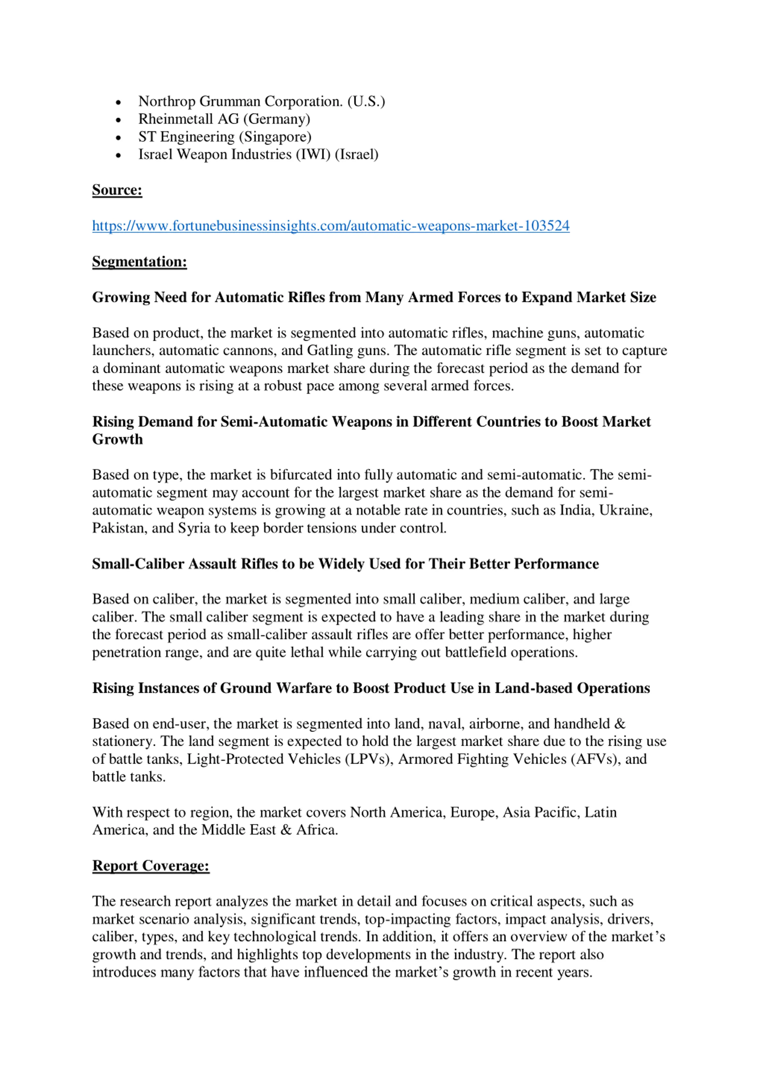 Northrop Grumman Corporation. (U.S.) Rheinmetall AG (Germany) ST Engineering (Singapore) Israel Weapon Industries (IWI) (Israel) Source: https://www.fortunebusinessinsights.com/automatic-weapons-market-103524 Segmentation: Growing Need for Automatic Rifles from Many Armed Forces to Expand Market Size Based on product, the market is segmented into automatic rifles, machine guns, automatic launchers, automatic cannons, and Gatling guns. The automatic rifle segment is set to capture a dominant automatic weapons market share during the forecast period as the demand for these weapons is rising at a robust pace among several armed forces. Rising Demand for Semi-Automatic Weapons in Different Countries to Boost Market Growth Based on type, the market is bifurcated into fully automatic and semi-automatic. The semi- automatic segment may account for the largest market share as the demand for semi- automatic weapon systems is growing at a notable rate in countries, such as India, Ukraine, Pakistan, and Syria to keep border tensions under control. Small-Caliber Assault Rifles to be Widely Used for Their Better Performance Based on caliber, the market is segmented into small caliber, medium caliber, and large caliber. The small caliber segment is expected to have a leading share in the market during the forecast period as small-caliber assault rifles are offer better performance, higher penetration range, and are quite lethal while carrying out battlefield operations. Rising Instances of Ground Warfare to Boost Product Use in Land-based Operations Based on end-user, the market is segmented into land, naval, airborne, and handheld & stationery. The land segment is expected to hold the largest market share due to the rising use of battle tanks, Light-Protected Vehicles (LPVs), Armored Fighting Vehicles (AFVs), and battle tanks. With respect to region, the market covers North America, Europe, Asia Pacific, Latin America, and the Middle East & Africa. Report Coverage: The research report analyzes the market in detail and focuses on critical aspects, such as market scenario analysis, significant trends, top-impacting factors, impact analysis, drivers, caliber, types, and key technological trends. In addition, it offers an overview of the market s growth and trends, and highlights top developments in the industry. The report also introduces many factors that have influenced the market s growth in recent years.