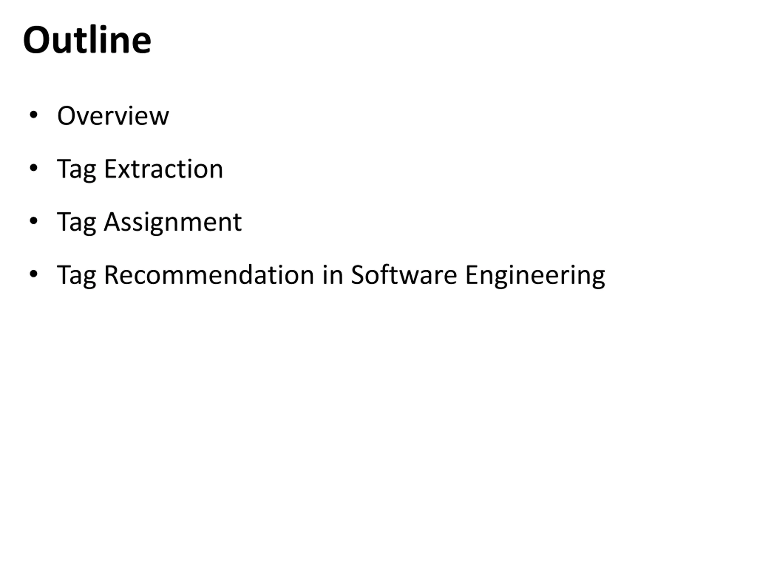 Outline Overview Tag Extraction Tag Assignment Tag Recommendation in Software Engineering