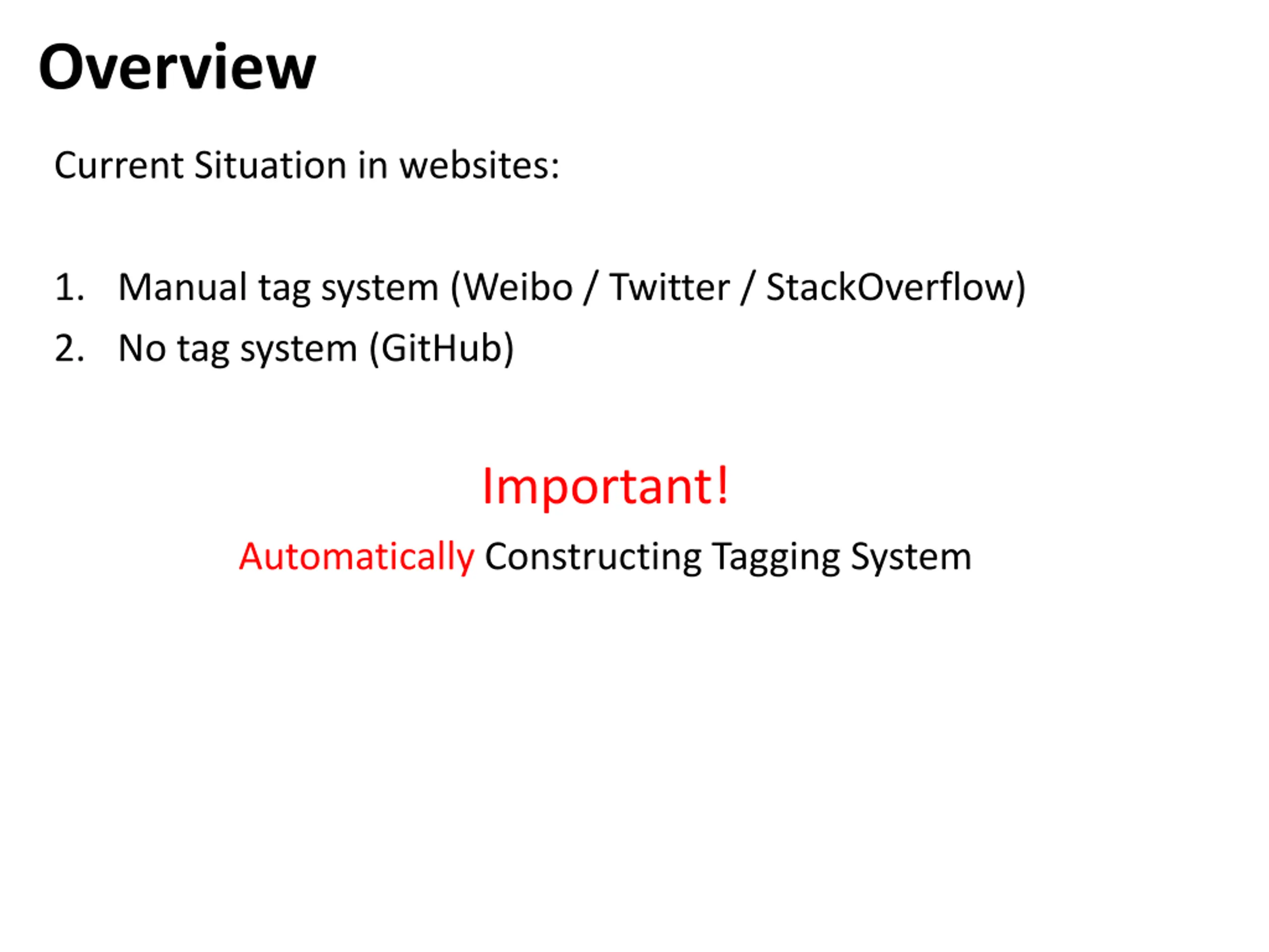 Overview Current Situation in websites: 1. Manual tag system (Weibo / Twitter / StackOverflow) 2. No tag system (GitHub) Important! Automatically Constructing Tagging System