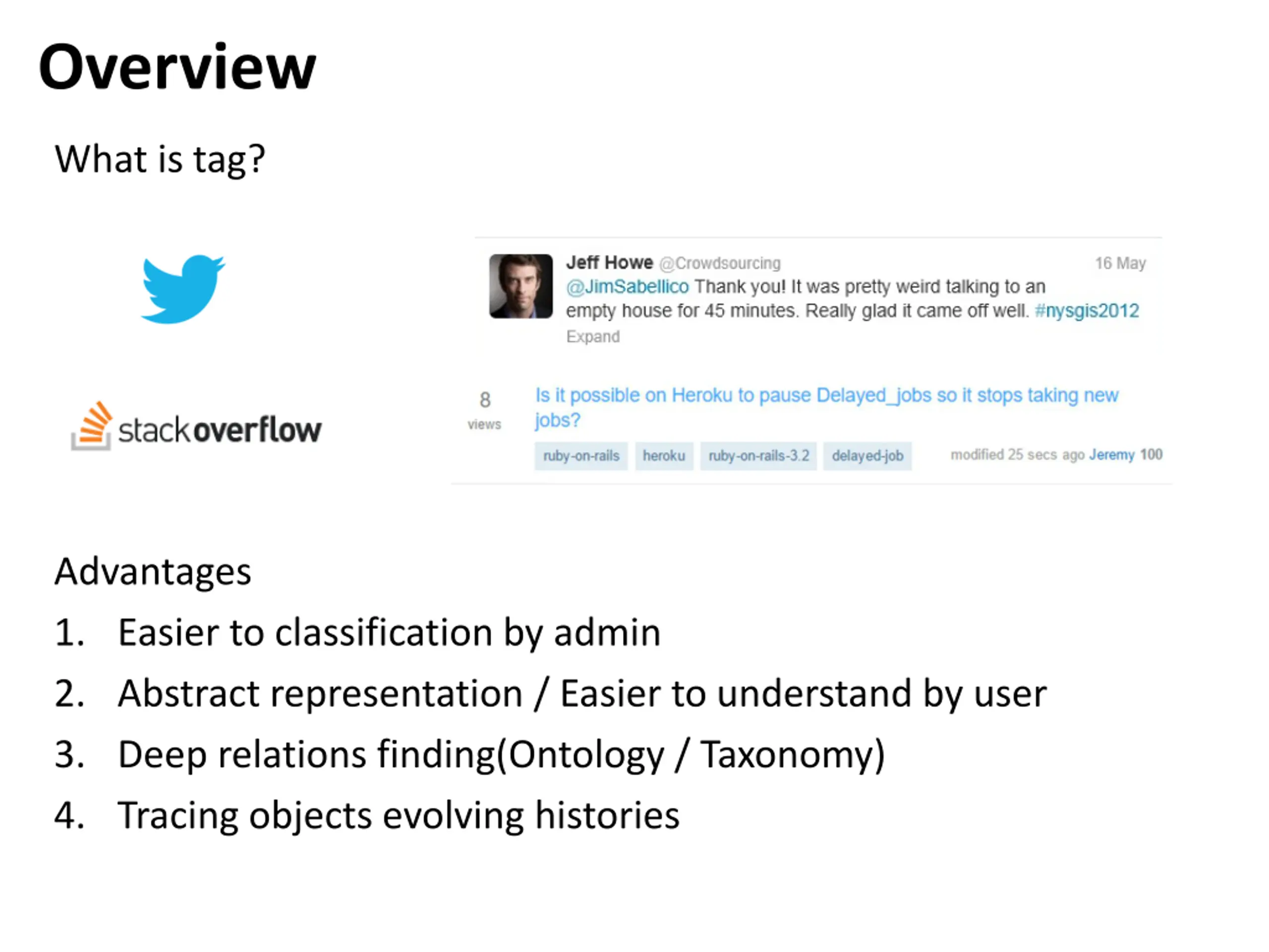 Overview What is tag? Advantages 1. Easier to classification by admin 2. Abstract representation / Easier to understand by user 3. Deep relations finding(Ontology / Taxonomy) 4. Tracing objects evolving histories