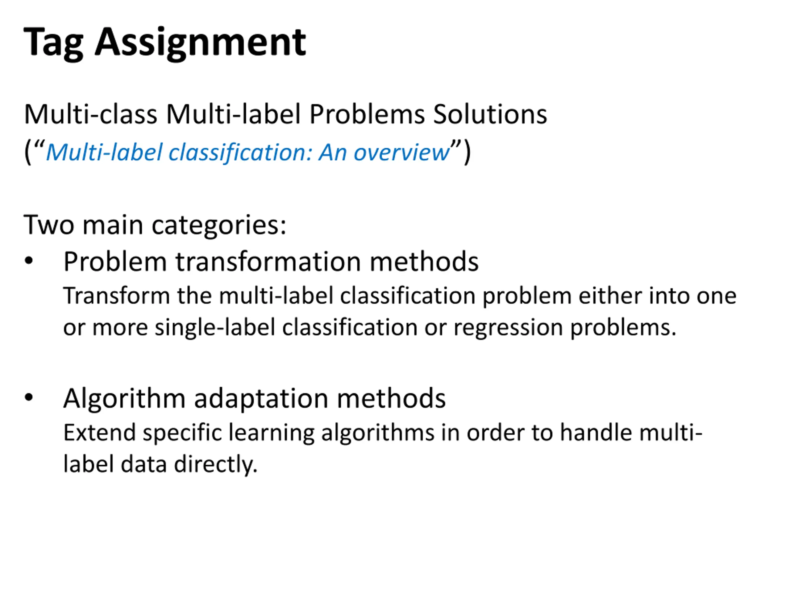 Tag Assignment Multi-class Multi-label Problems Solutions ( Multi-label classification: An overview ) Two main categories: Problem transformation methods Transform the multi-label classification problem either into one or more single-label classification or regression problems. Algorithm adaptation methods Extend specific learning algorithms in order to handle multi- label data directly.