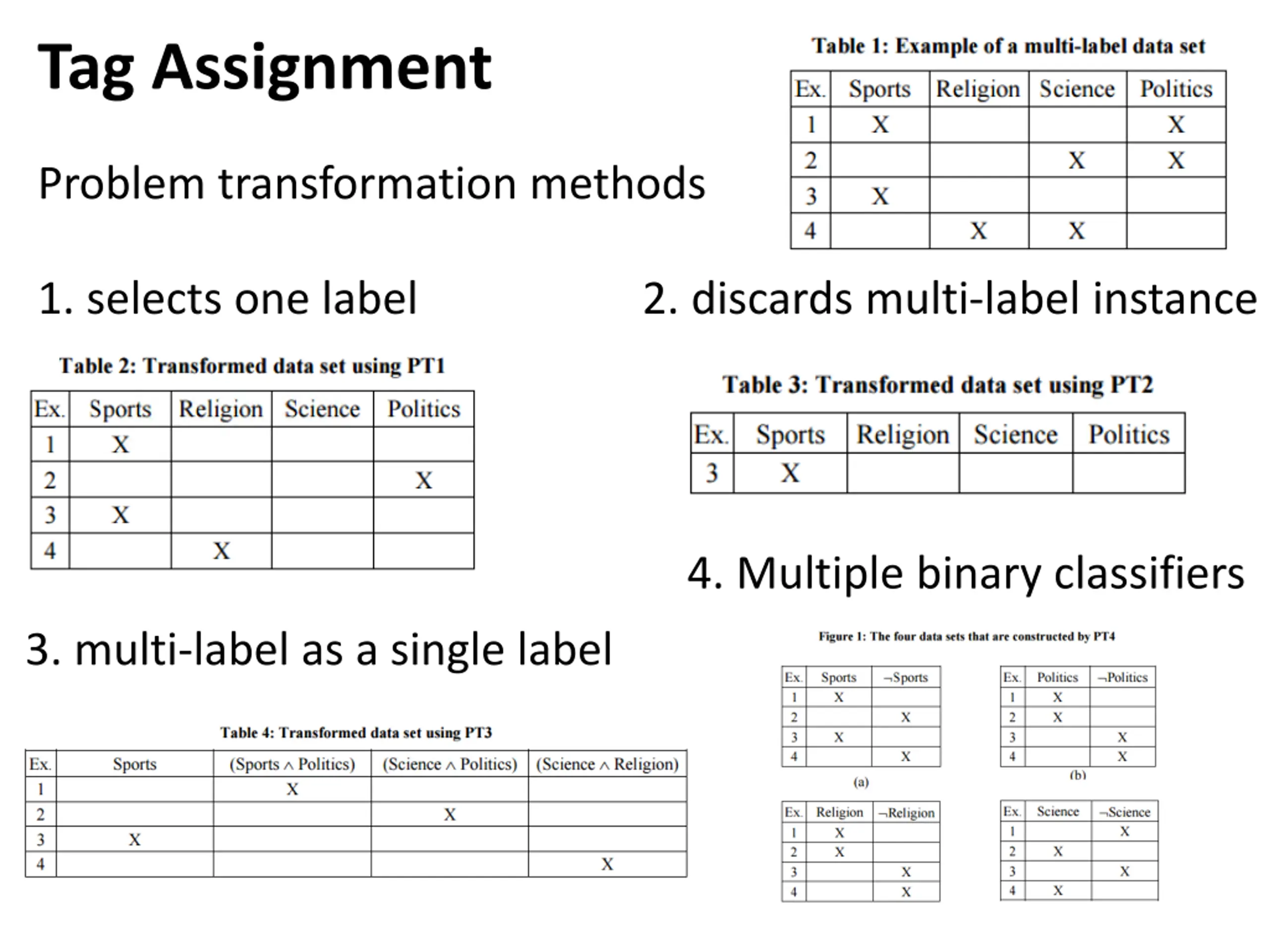 Tag Assignment Problem transformation methods 1. selects one label 2. discards multi-label instance 4. Multiple binary classifiers 3. multi-label as a single label