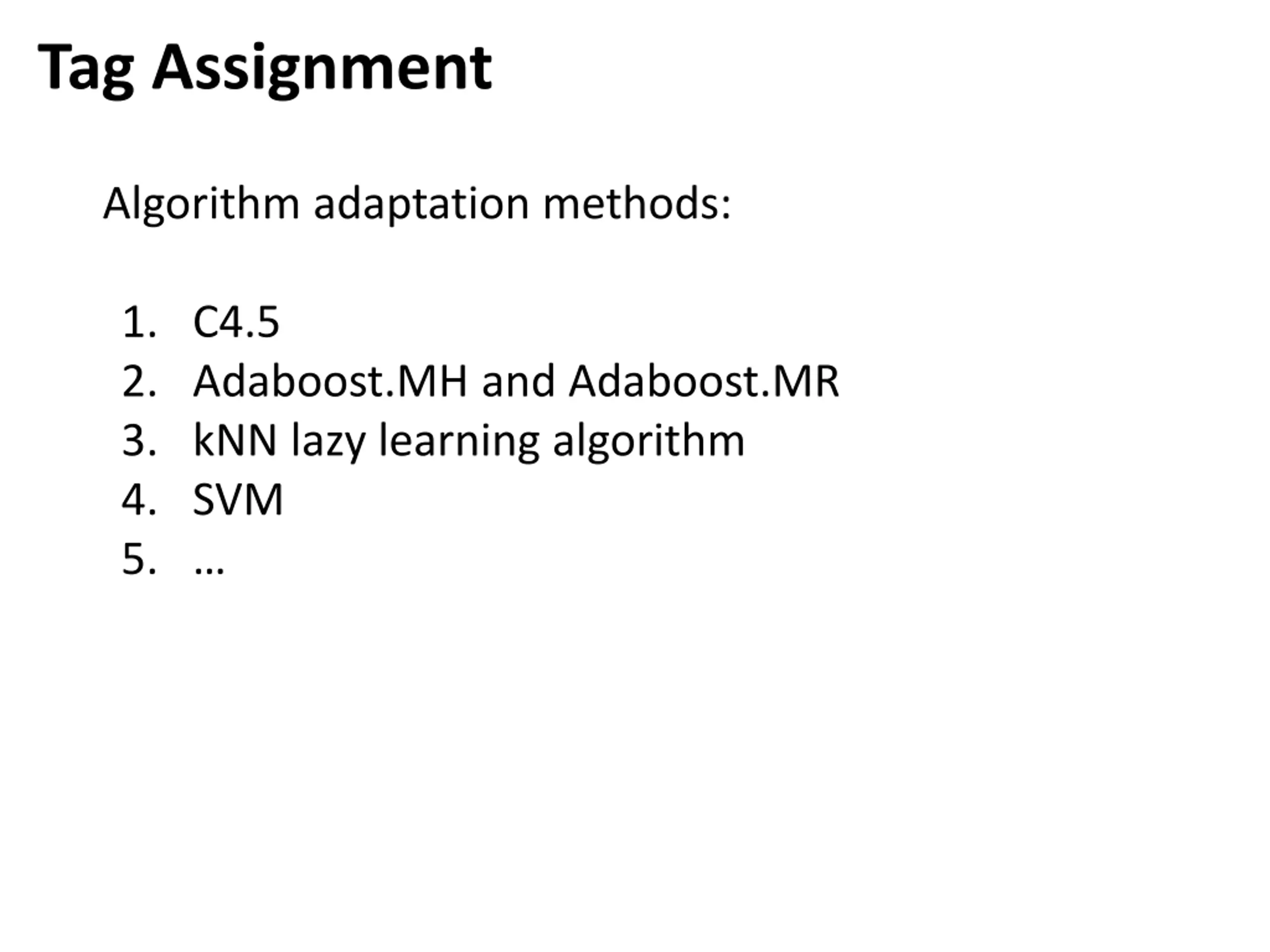 Tag Assignment Algorithm adaptation methods: 1. C4.5 2. Adaboost.MH and Adaboost.MR 3. kNN lazy learning algorithm 4. SVM 5.