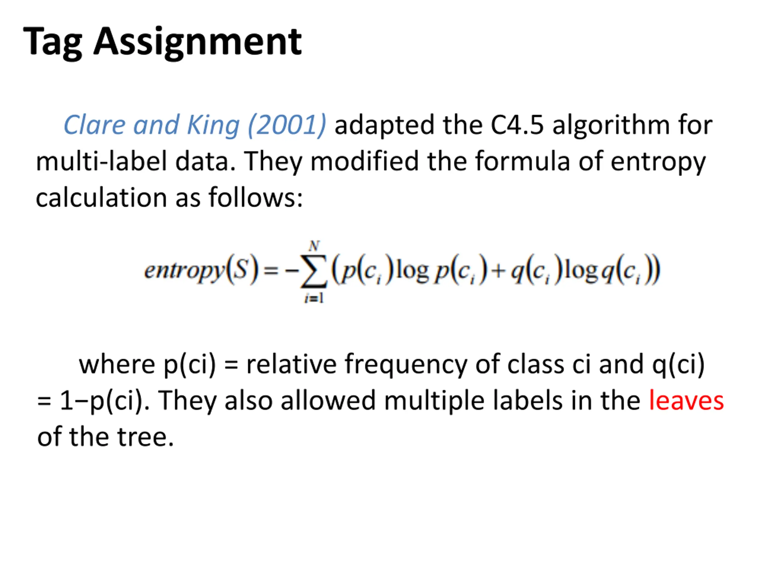 Tag Assignment Clare and King (2001) adapted the C4.5 algorithm for multi-label data. They modified the formula of entropy calculation as follows: where p(ci) = relative frequency of class ci and q(ci) = 1 p(ci). They also allowed multiple labels in the leaves of the tree.