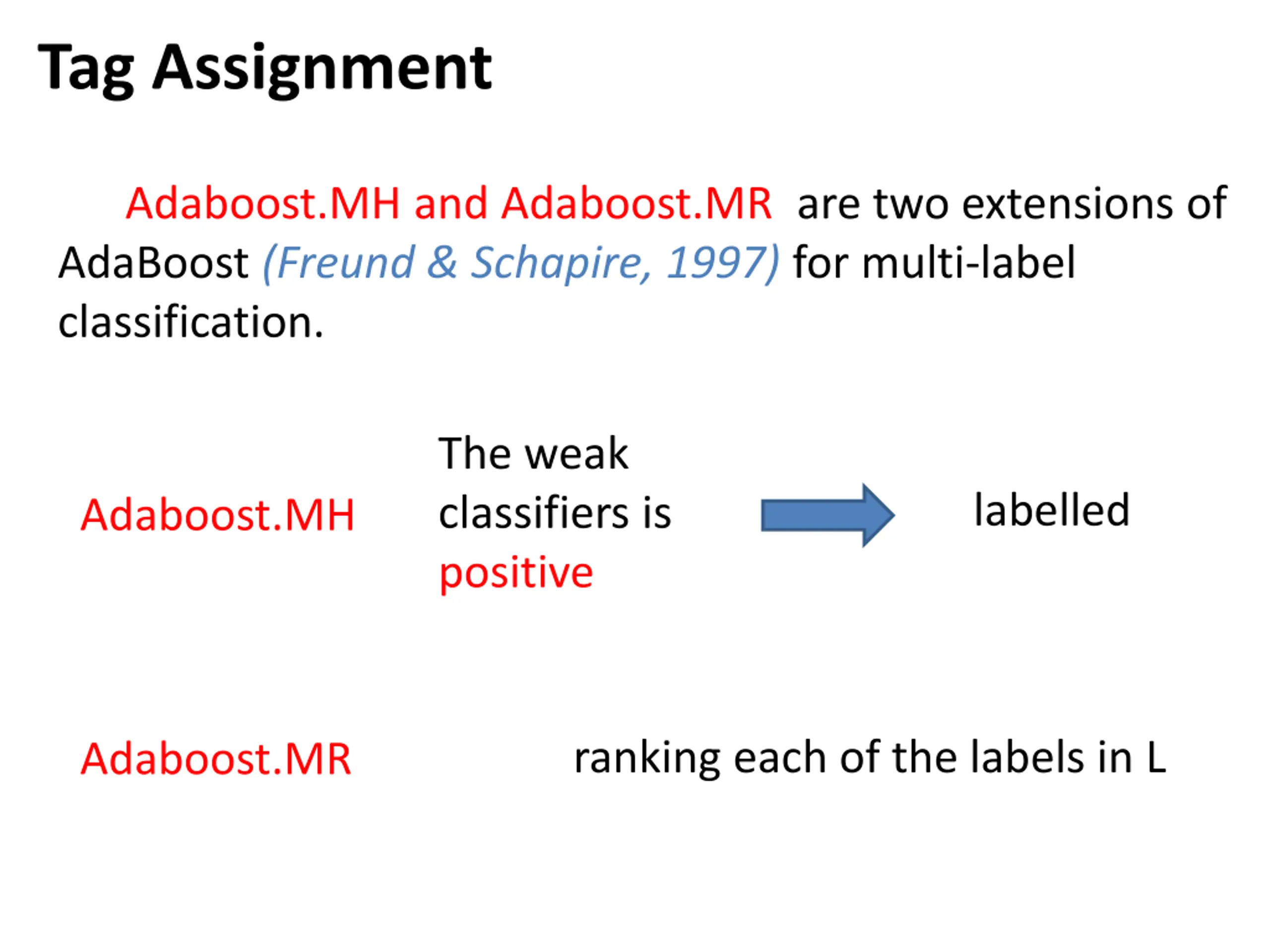 Tag Assignment Adaboost.MH and Adaboost.MR are two extensions of AdaBoost (Freund & Schapire, 1997) for multi-label classification. The weak classifiers is positive labelled Adaboost.MH ranking each of the labels in L Adaboost.MR