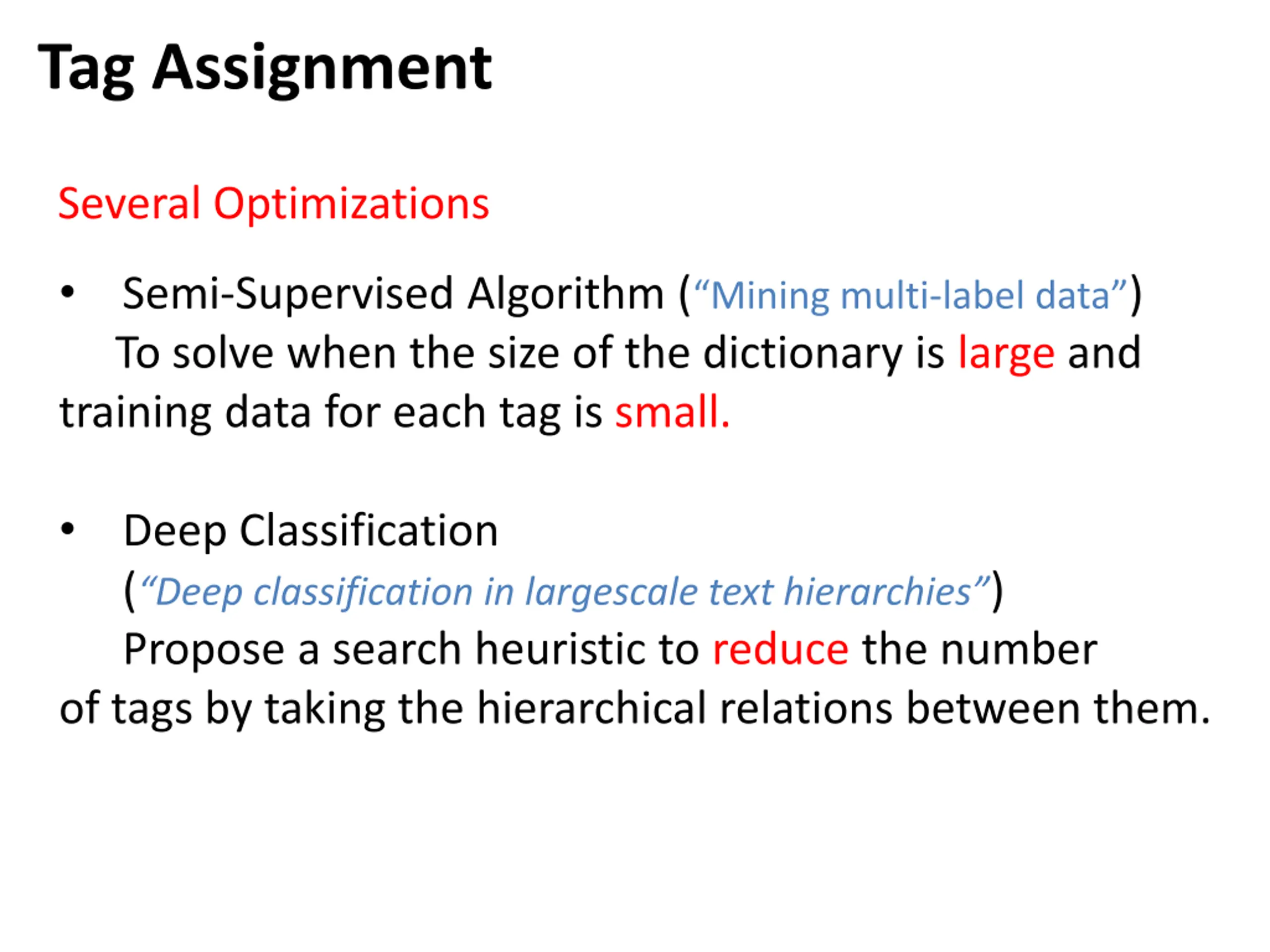 Tag Assignment Several Optimizations Semi-Supervised Algorithm ( Mining multi-label data ) To solve when the size of the dictionary is large and training data for each tag is small. Deep Classification ( Deep classification in largescale text hierarchies ) Propose a search heuristic to reduce the number of tags by taking the hierarchical relations between them.
