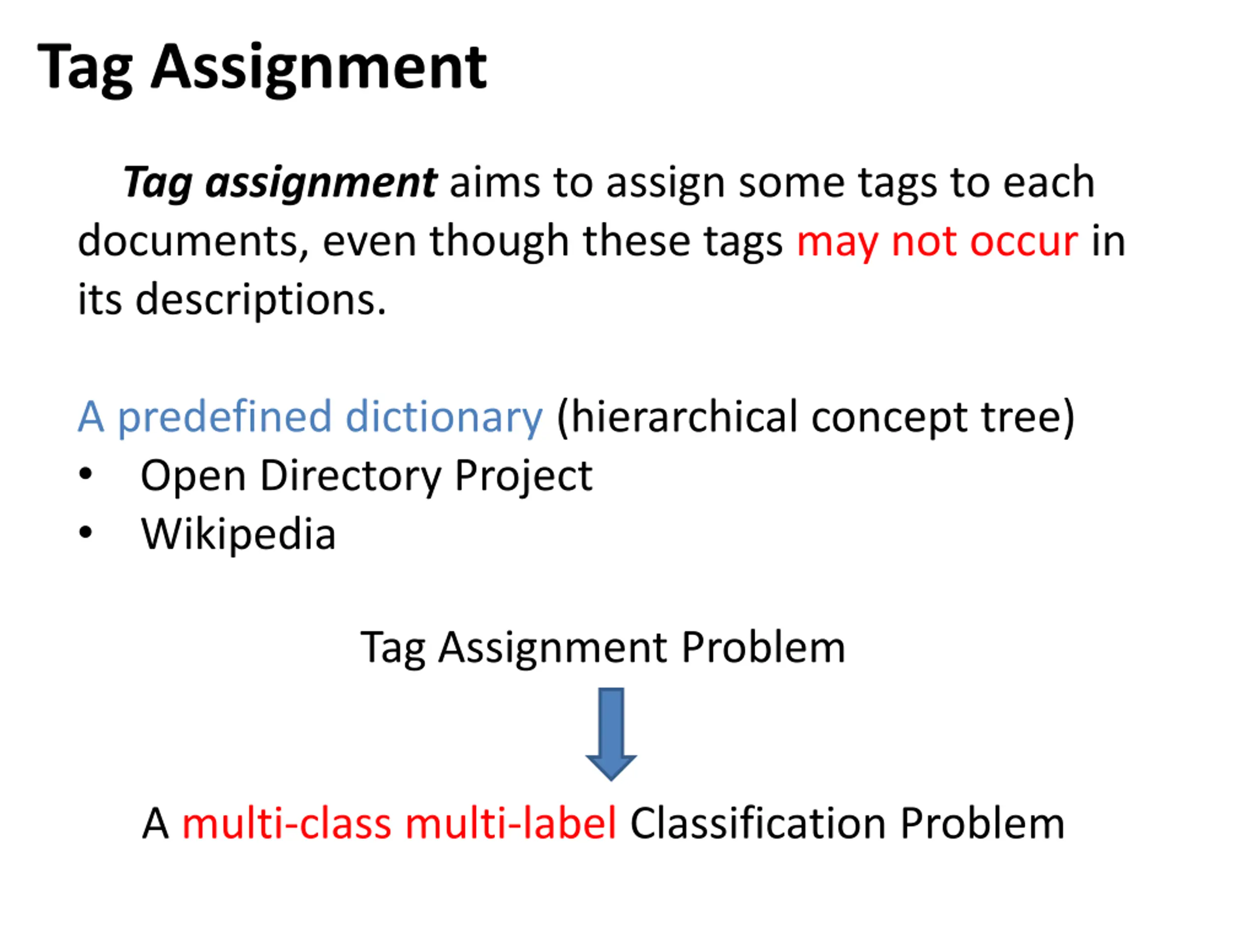 Tag Assignment Tag assignment aims to assign some tags to each documents, even though these tags may not occur in its descriptions. A predefined dictionary (hierarchical concept tree) Open Directory Project Wikipedia Tag Assignment Problem A multi-class multi-label Classification Problem