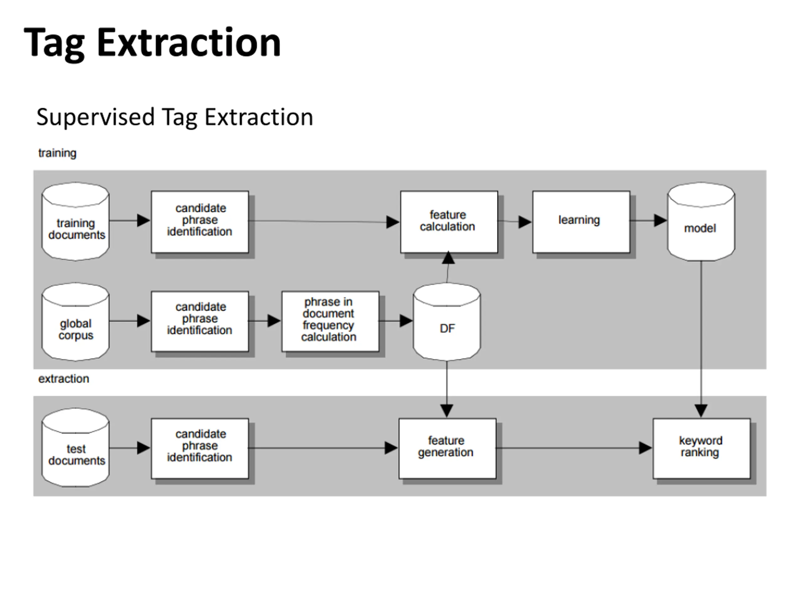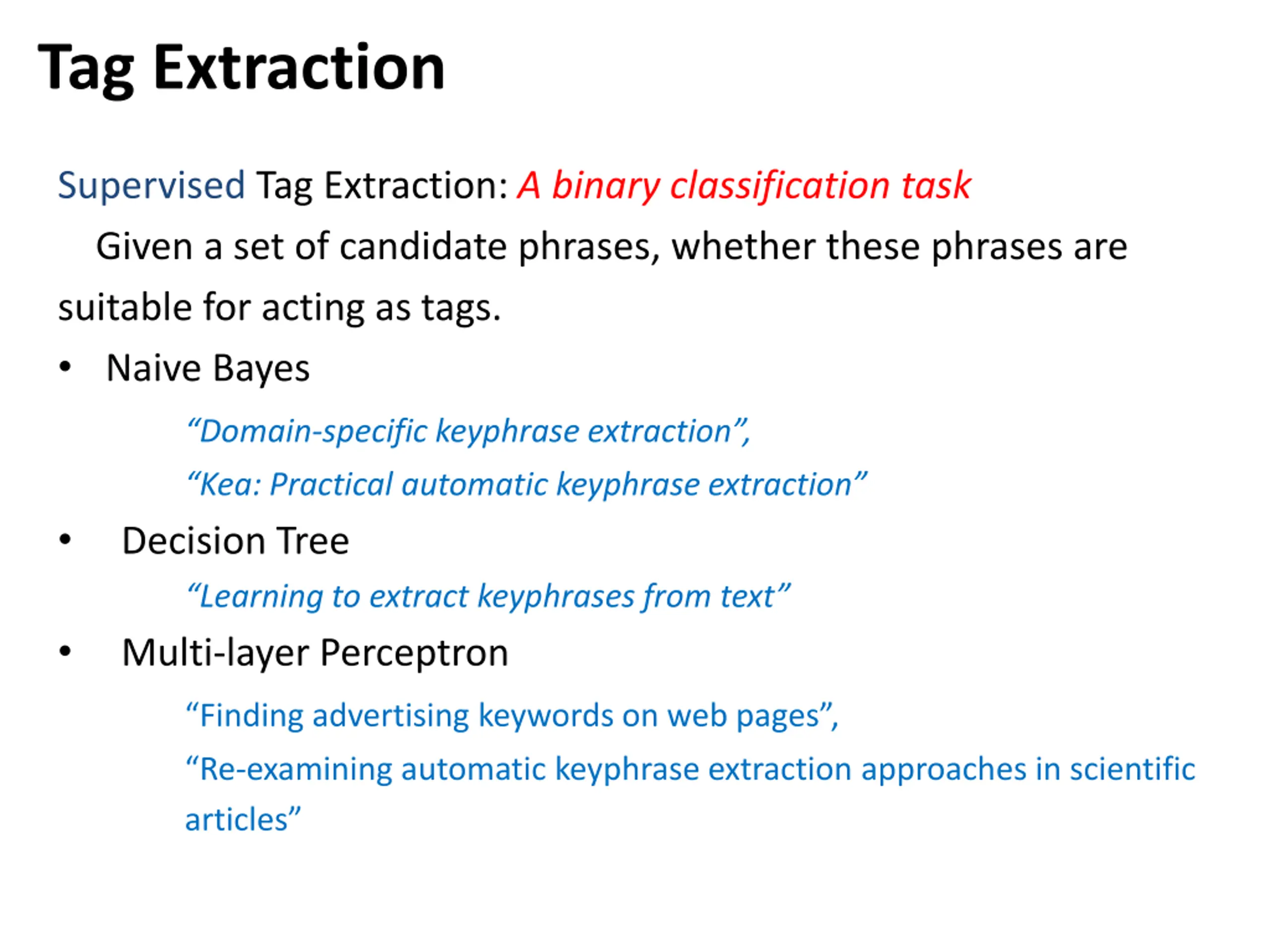 Tag Extraction Supervised Tag Extraction: A binary classification task Given a set of candidate phrases, whether these phrases are suitable for acting as tags. Naive Bayes Domain-specific keyphrase extraction , Kea: Practical automatic keyphrase extraction Decision Tree Learning to extract keyphrases from text Multi-layer Perceptron Finding advertising keywords on web pages , Re-examining automatic keyphrase extraction approaches in scientific articles