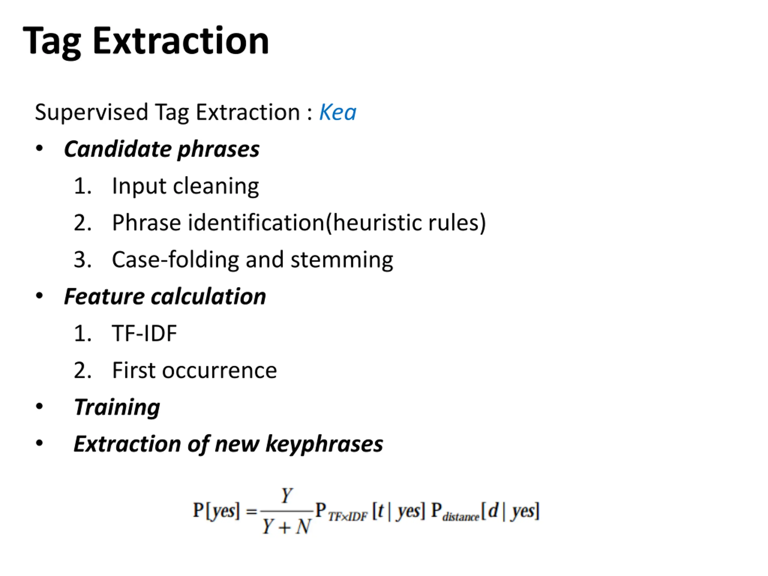 Tag Extraction Supervised Tag Extraction : Kea Candidate phrases 1. Input cleaning 2. Phrase identification(heuristic rules) 3. Case-folding and stemming Feature calculation 1. TF-IDF 2. First occurrence Training Extraction of new keyphrases