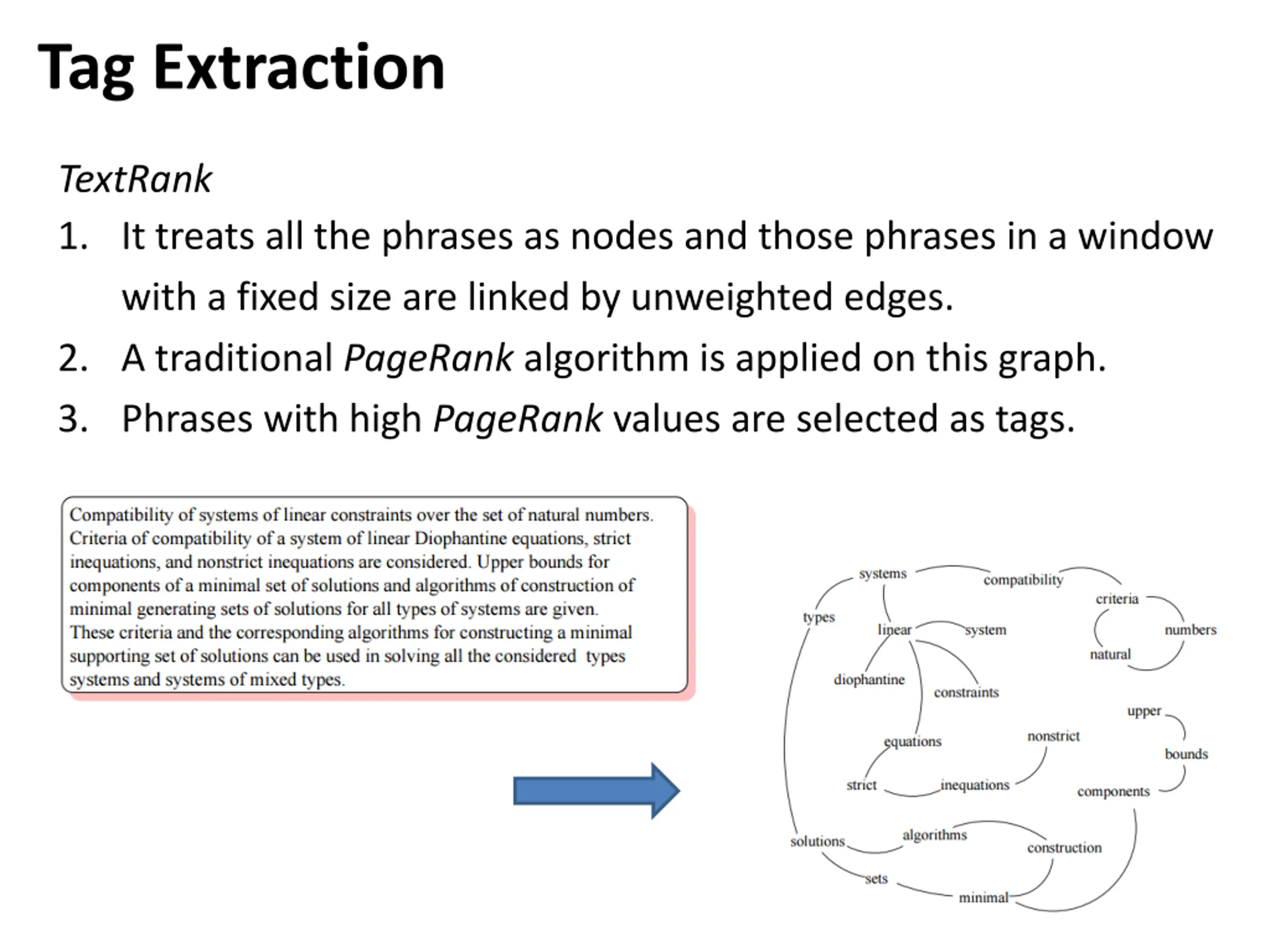 Tag Extraction Unsupervised Tag Extraction: Graph-based Main Concept: Build a graph from the input document and rank its nodes using a graph-based ranking method. TextRank( Textrank: Bringing order into texts ) It treats all the phrases as nodes and those phrases in a window with a fixed size are linked by unweighted edges.
