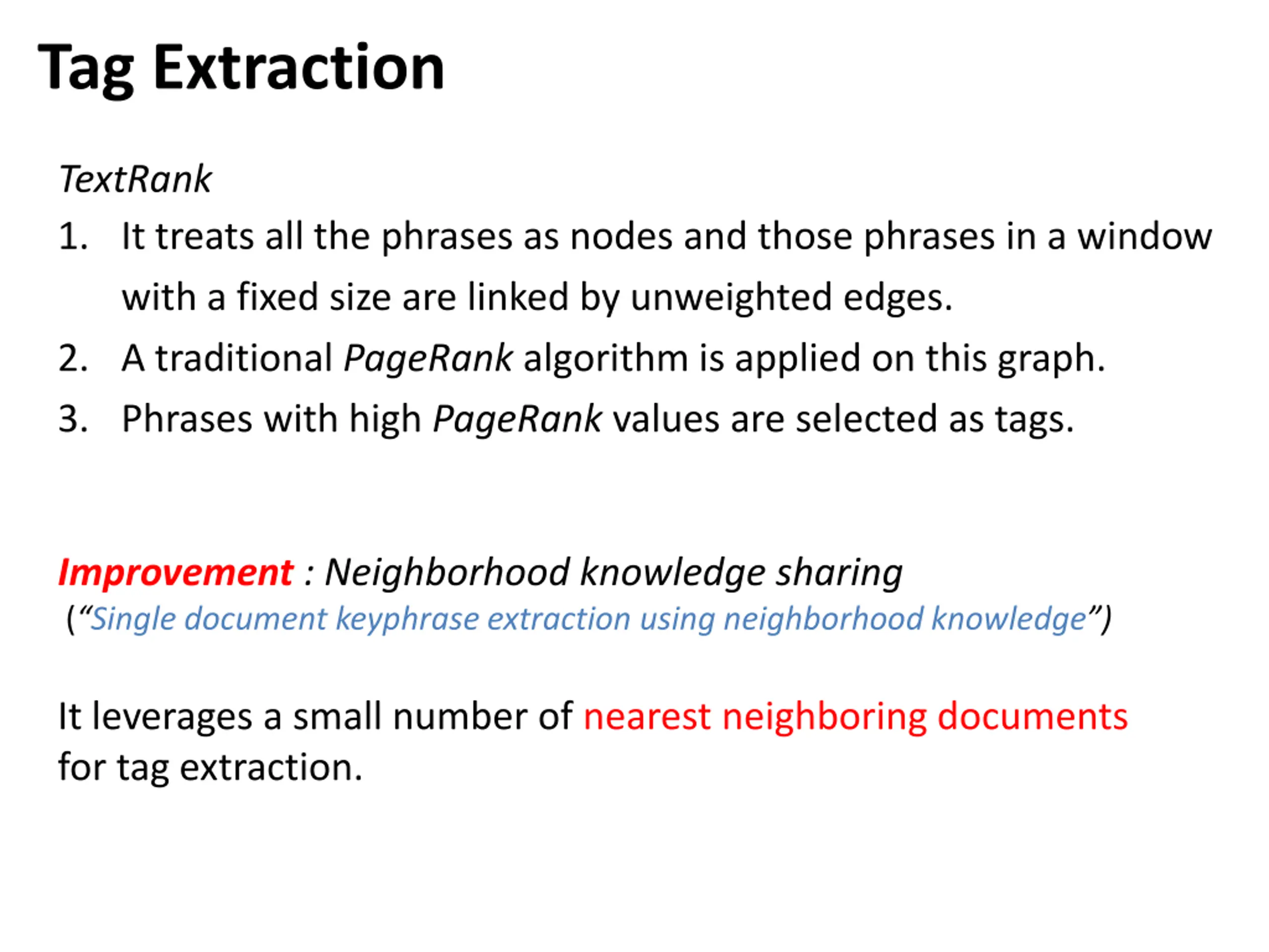 Tag Extraction TextRank 1. It treats all the phrases as nodes and those phrases in a window with a fixed size are linked by unweighted edges. 2. A traditional PageRank algorithm is applied on this graph. 3. Phrases with high PageRank values are selected as tags. Improvement : Neighborhood knowledge sharing ( Single document keyphrase extraction using neighborhood knowledge ) It leverages a small number of nearest neighboring documents for tag extraction.