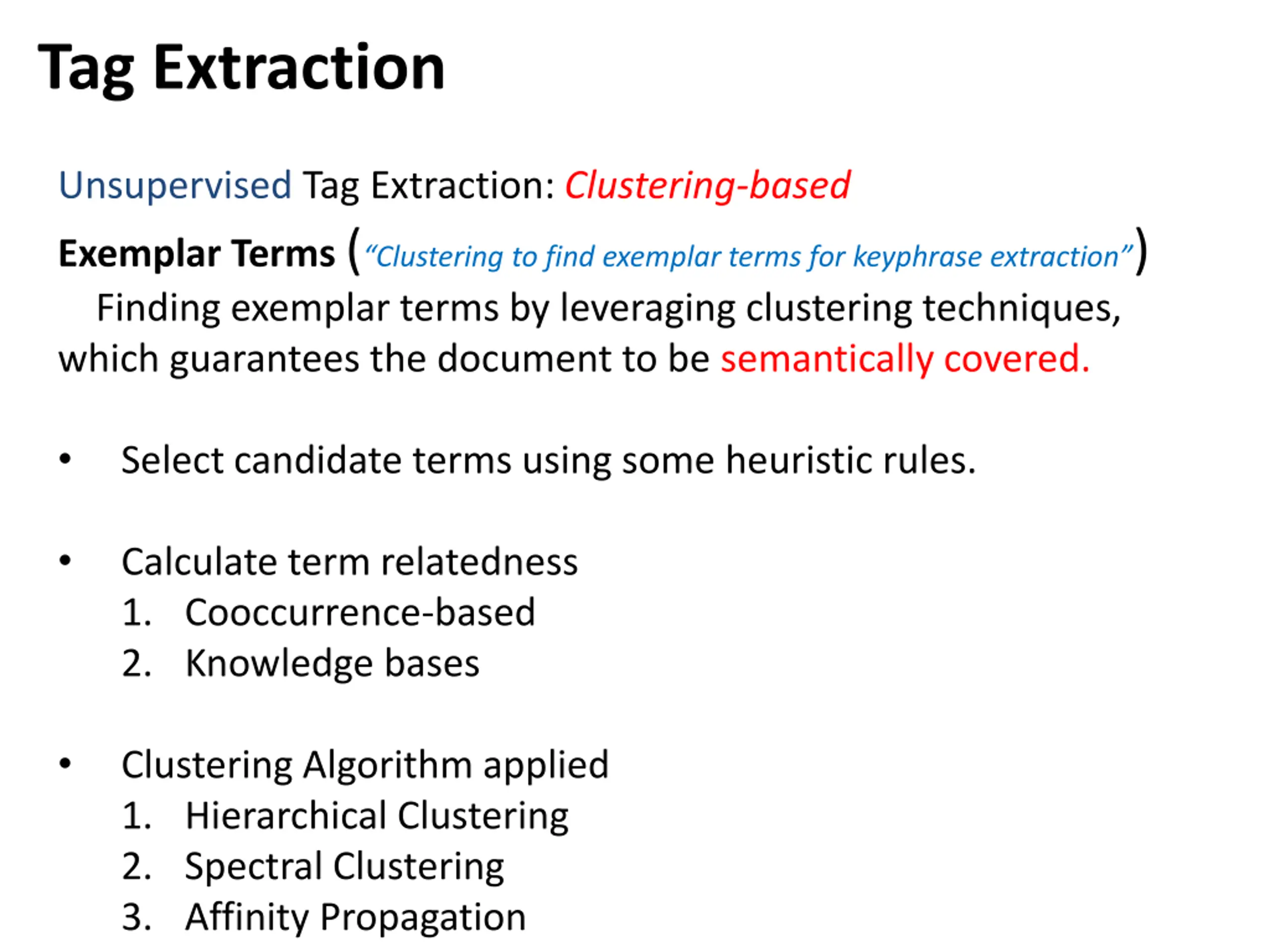 Tag Extraction Unsupervised Tag Extraction: Clustering-based Exemplar Terms( Clustering to find exemplar terms for keyphrase extraction ) Finding exemplar terms by leveraging clustering techniques, which guarantees the document to be semantically covered. Select candidate terms using some heuristic rules. Calculate term relatedness 1. Cooccurrence-based 2. Knowledge bases Clustering Algorithm applied 1. Hierarchical Clustering 2. Spectral Clustering 3. Affinity Propagation