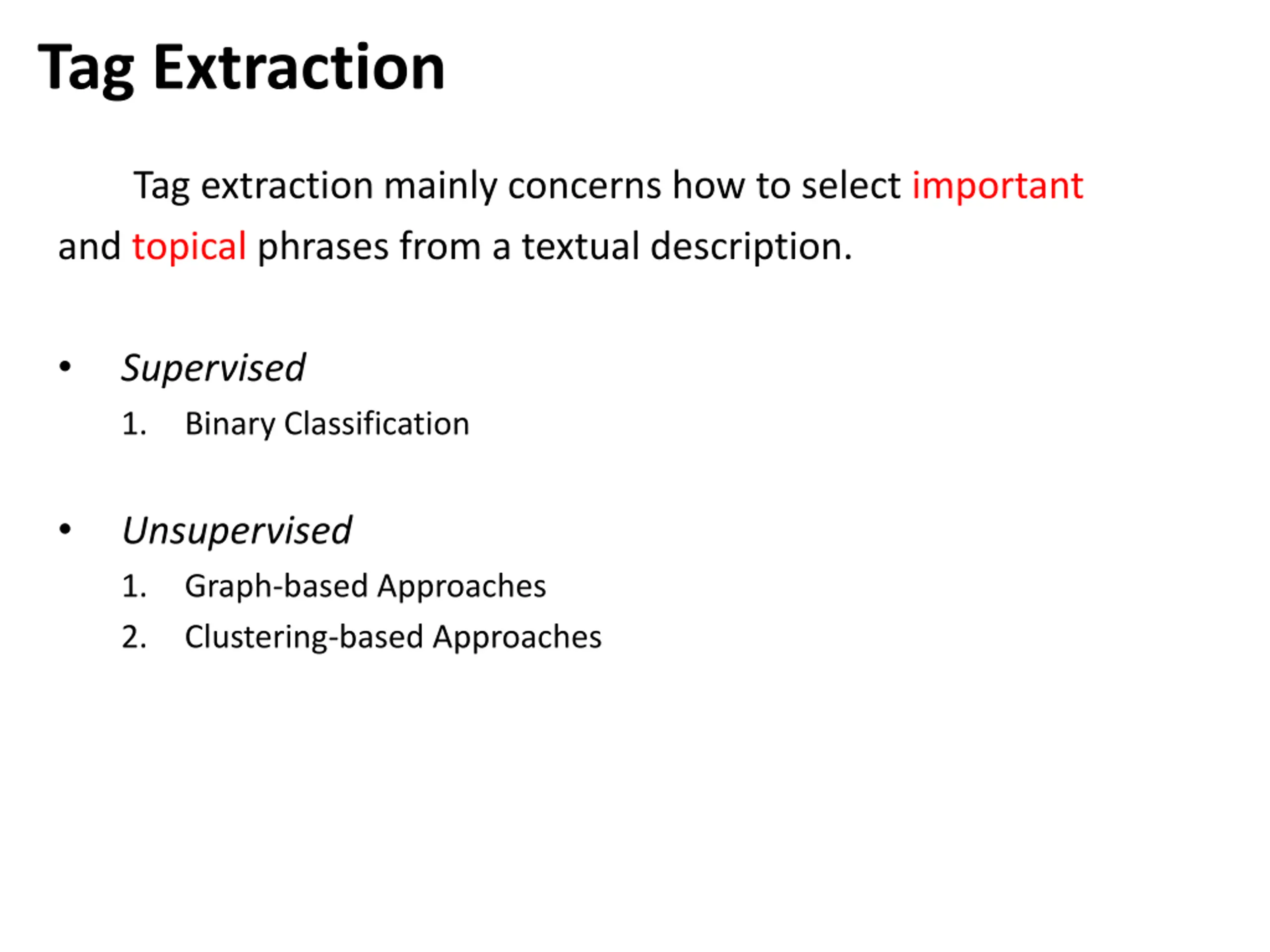 Tag Extraction Tag extraction mainly concerns how to select important and topical phrases from a textual description. Supervised 1. Binary Classification Unsupervised 1. Graph-based Approaches 2. Clustering-based Approaches