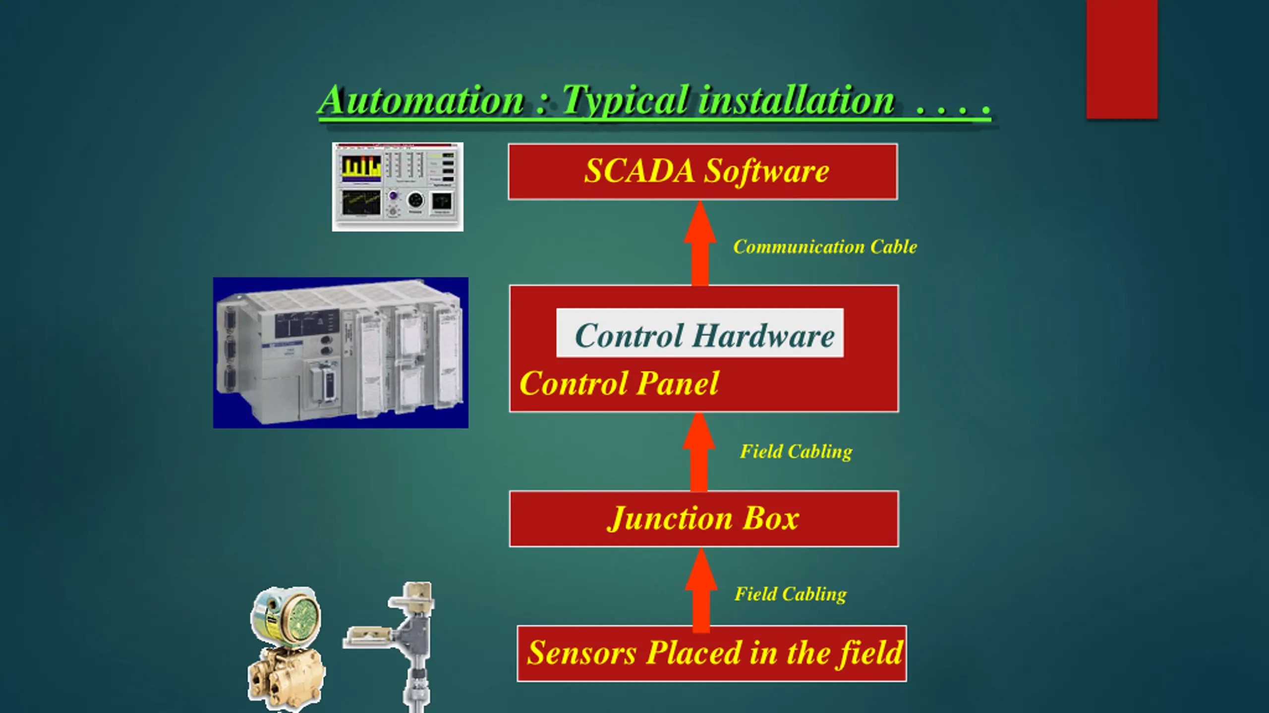 Automation : Typical installation . . . . SCADA Software Communication Cable Control Hardware Control Panel Field Cabling Junction Box Field Cabling Sensors Placed in the field