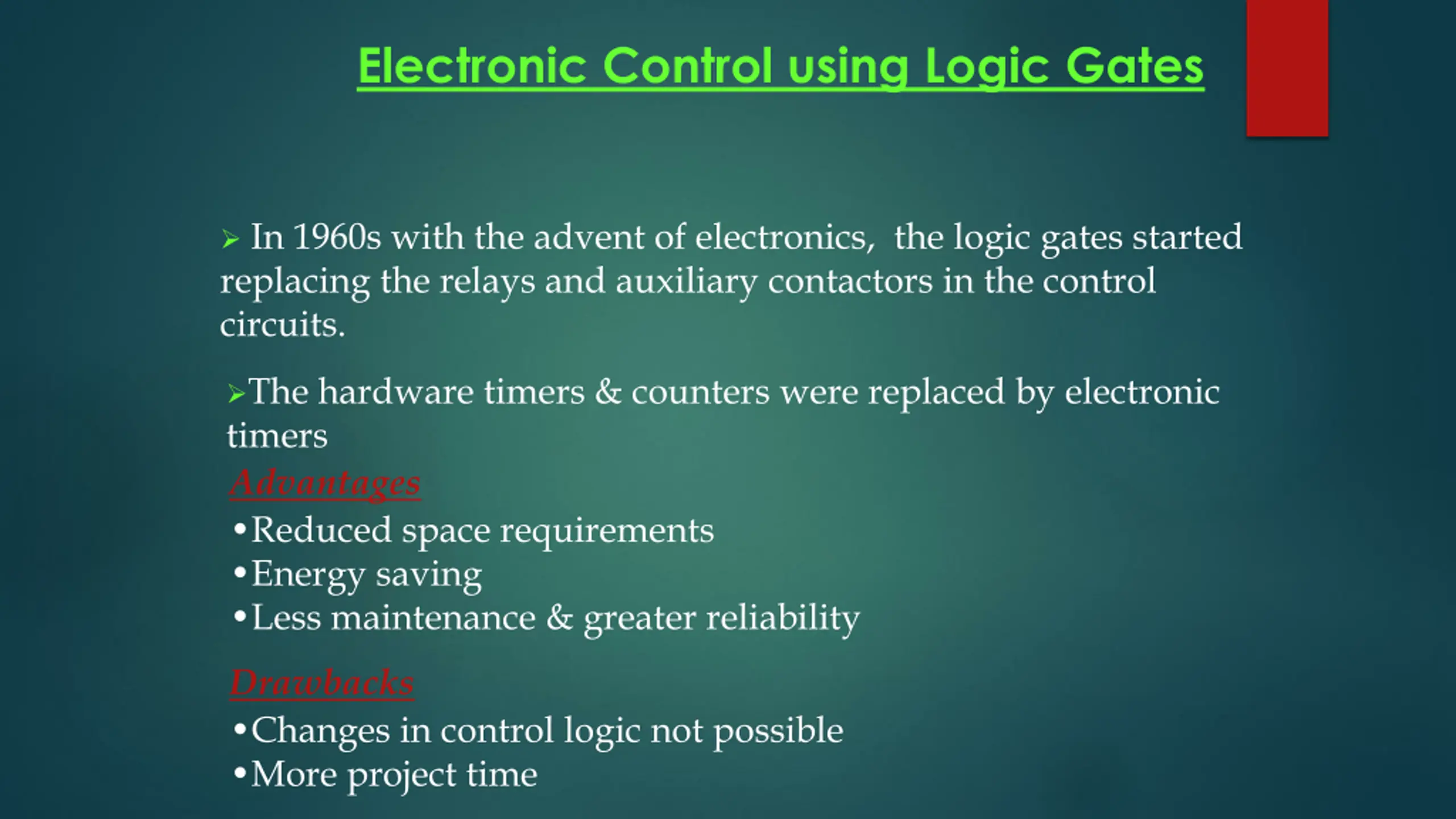 Electronic Control using Logic Gates In 1960s with the advent of electronics, the logic gates started replacing the relays and auxiliary contactors in the control circuits. The hardware timers & counters were replaced by electronic timers Advantages Reduced space requirements Energy saving Less maintenance & greater reliability Drawbacks Changes in control logic not possible More project time