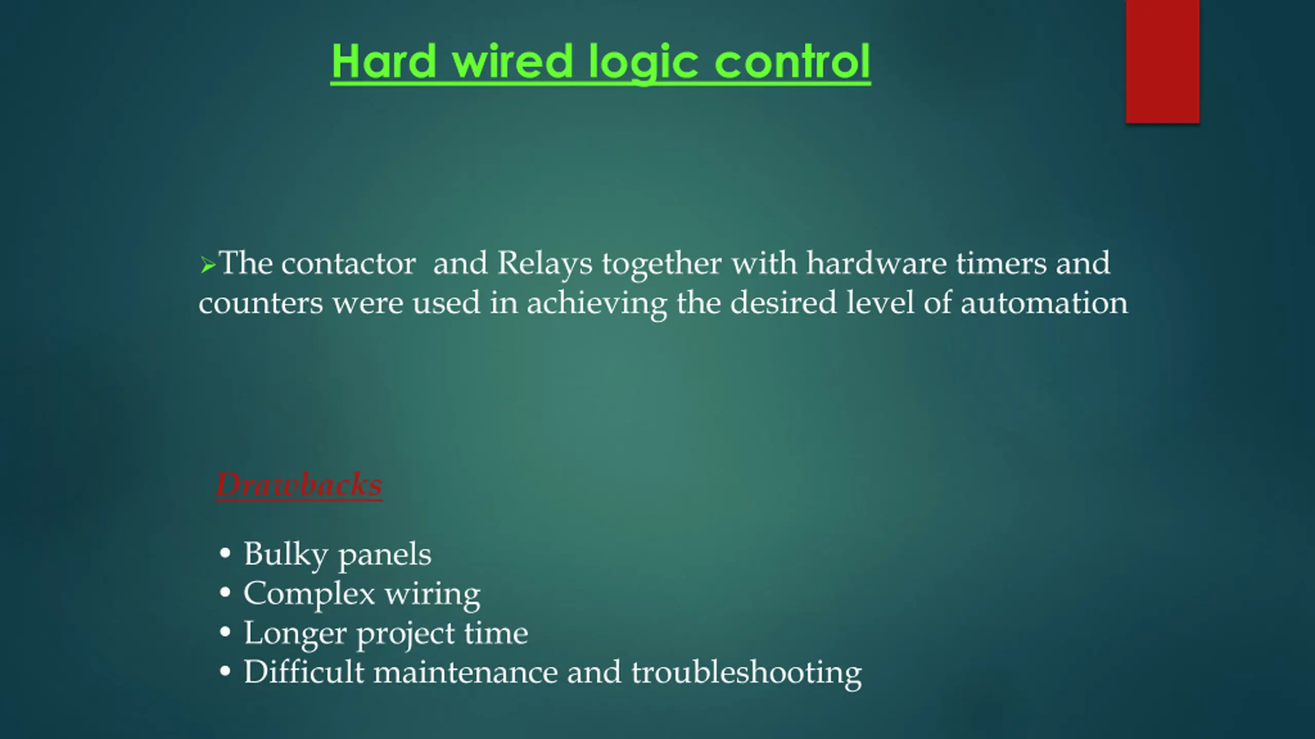 Hard wired logic control The contactor and Relays together with hardware timers and counters were used in achieving the desired level of automation Drawbacks Bulky panels Complex wiring Longer project time Difficult maintenance and troubleshooting