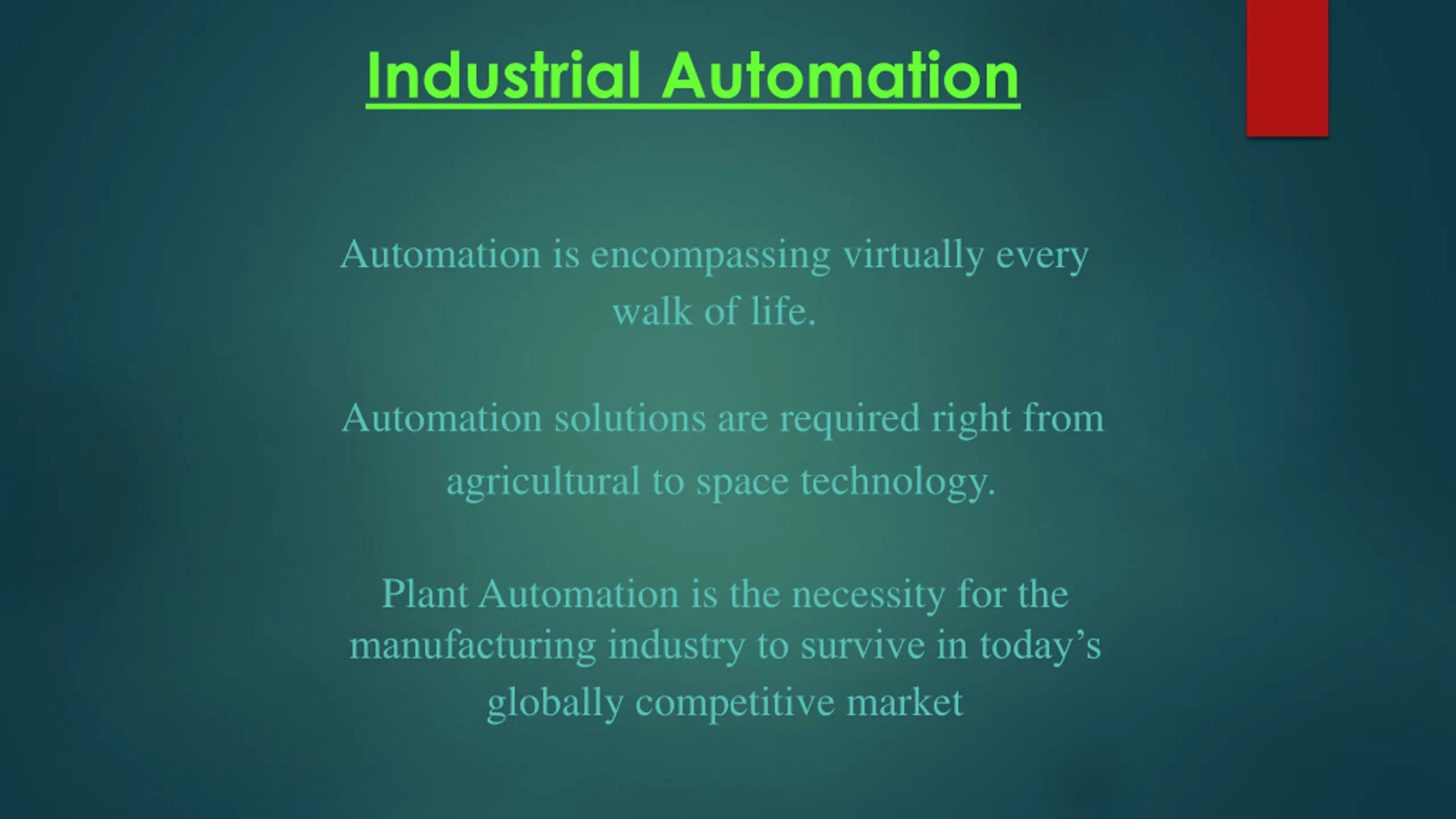 Industrial Automation Automation is encompassing virtually every walk of life. Automation solutions are required right from agricultural to space technology. Plant Automation is the necessity for the manufacturing industry to survive in today s globally competitive market